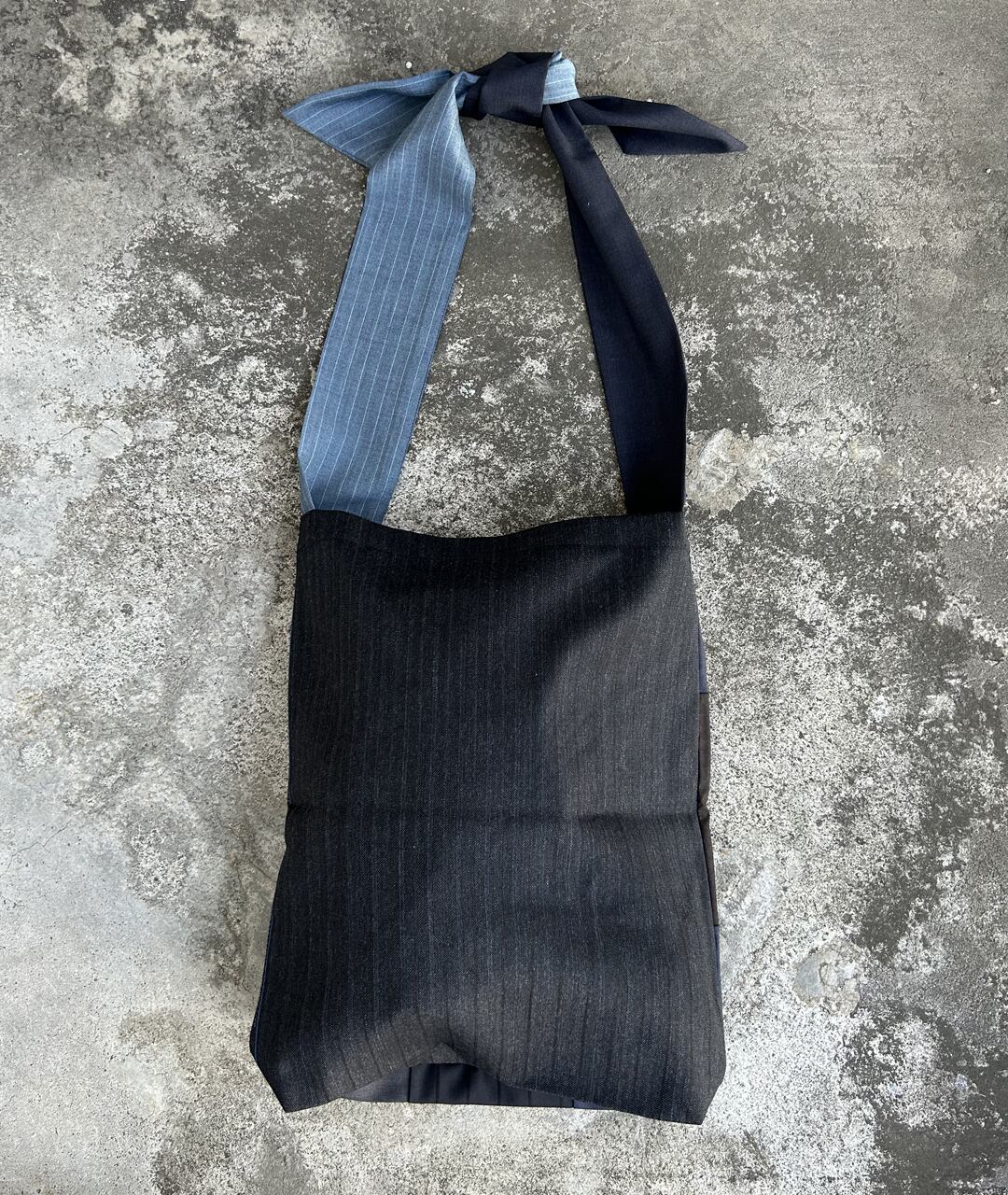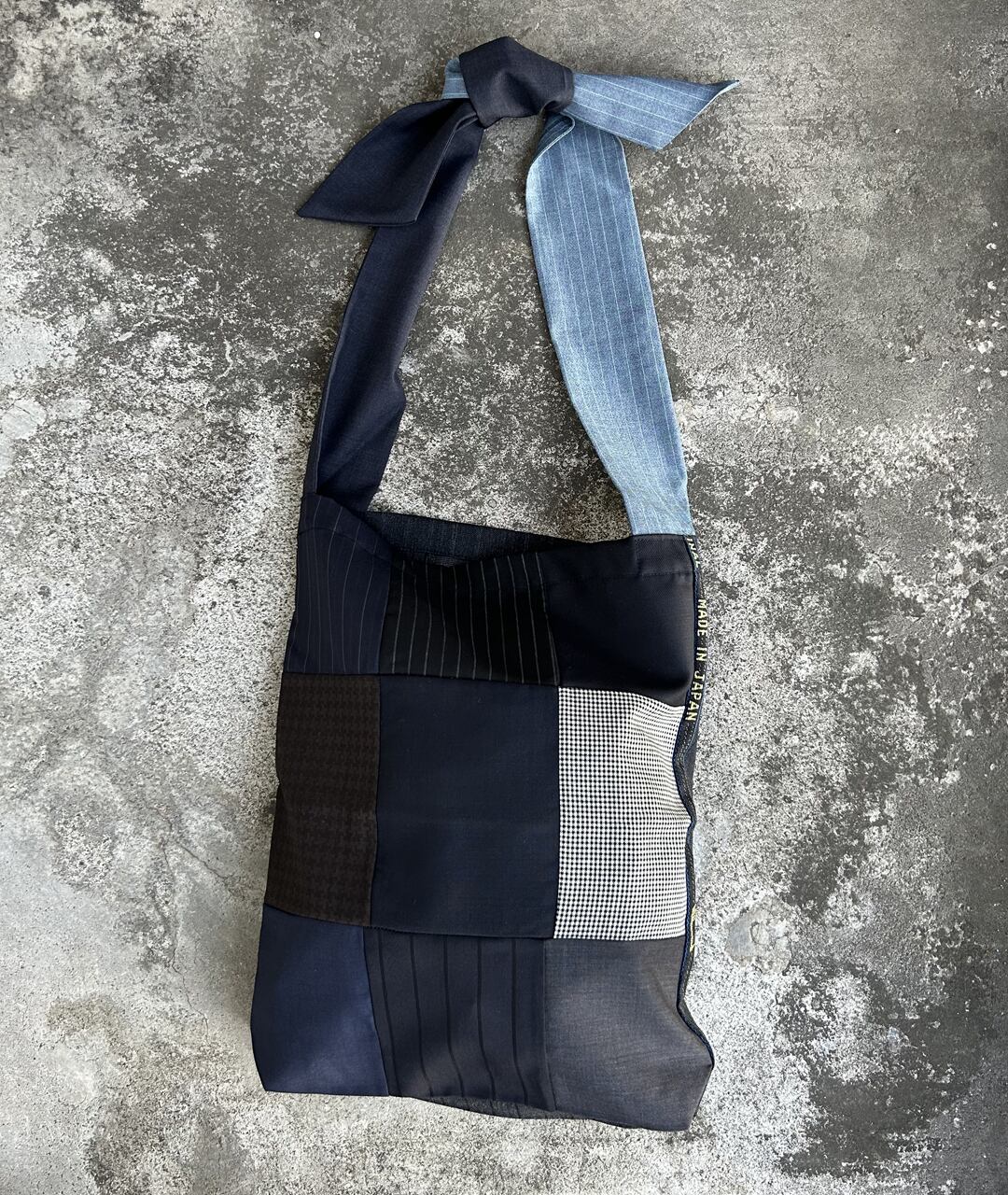 老舗スーツ工場から生産する際に出る端材、残生地を利用したパッチワークのトートバッグ。持ち手は、結ぶタイプなので長さ調節が可能です。
