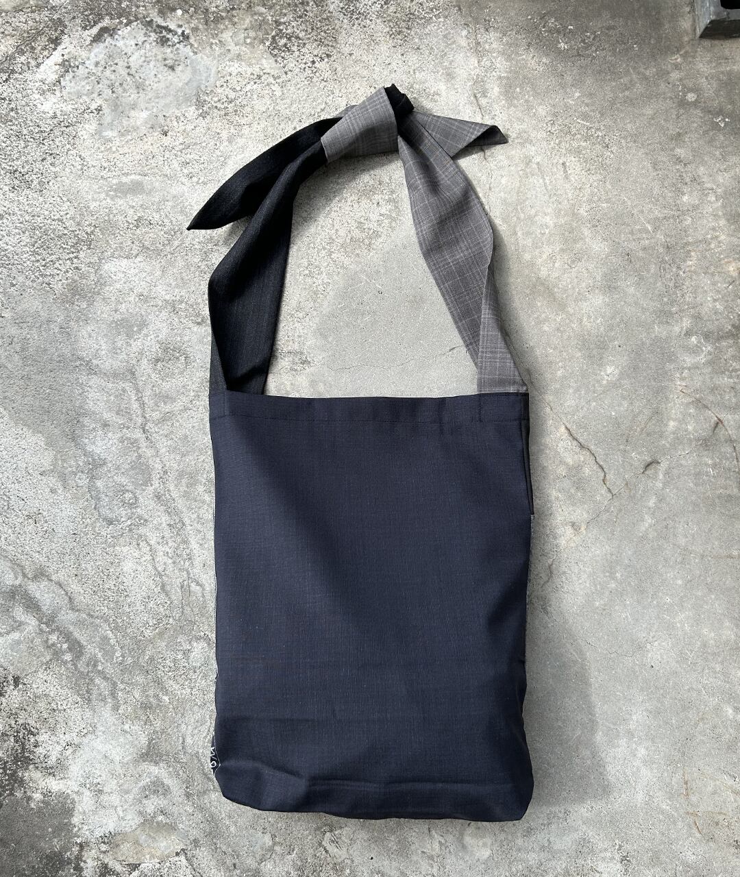 老舗スーツ工場から生産する際に出る端材、残生地を利用したパッチワークのトートバッグ。持ち手は、結ぶタイプなので長さ調節が可能です。
