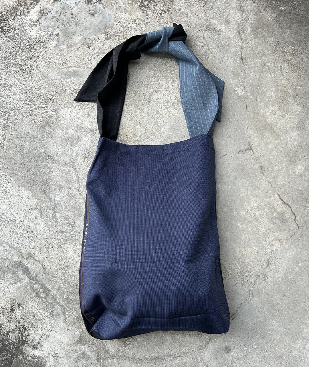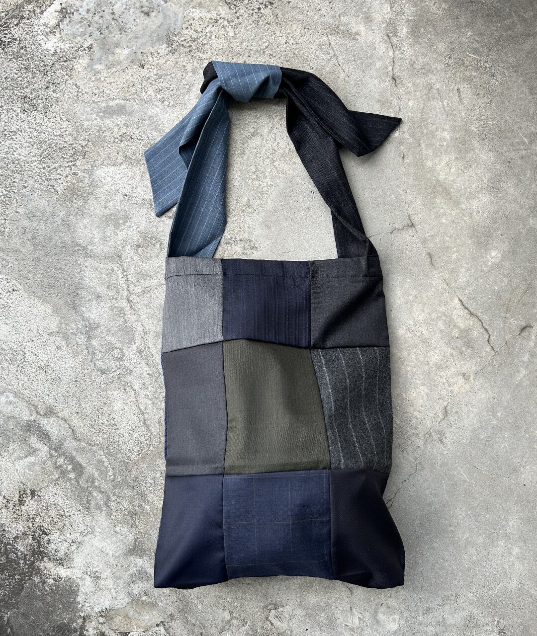 老舗スーツ工場から生産する際に出る端材、残生地を利用したパッチワークのトートバッグ。持ち手は、結ぶタイプなので長さ調節が可能です。