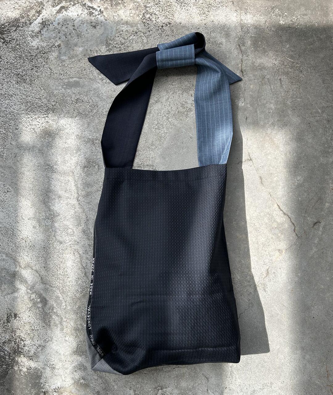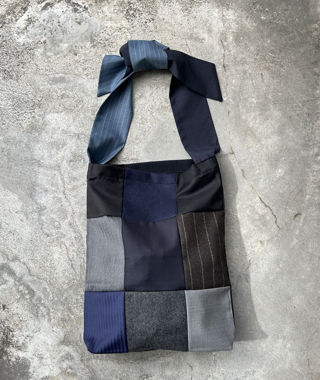 老舗スーツ工場から生産する際に出る端材、残生地を利用したパッチワークのトートバッグ。持ち手は、結ぶタイプなので長さ調節が可能です。