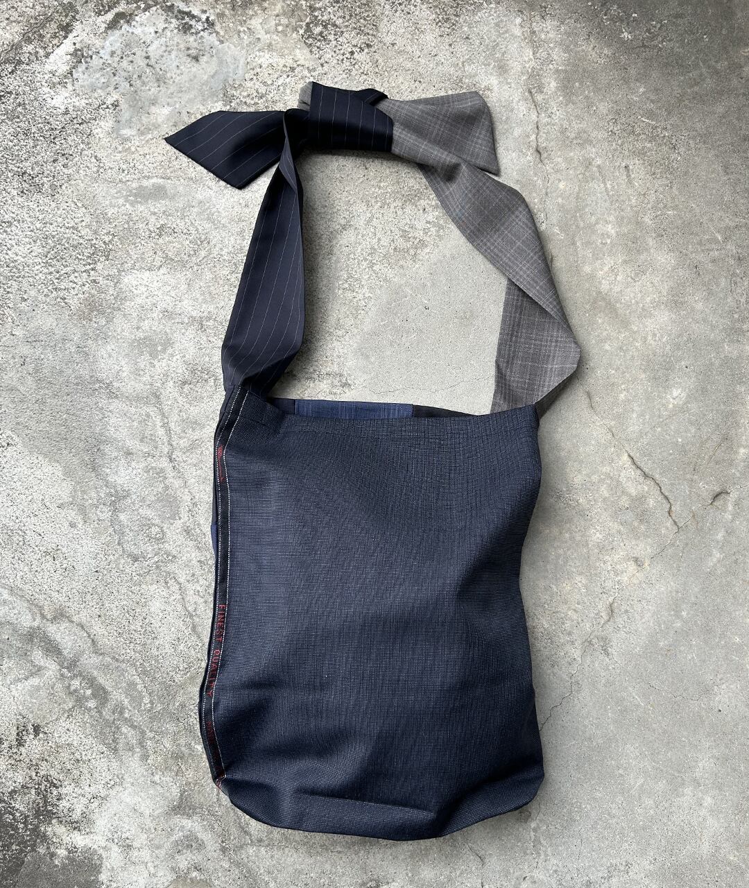 老舗スーツ工場から生産する際に出る端材、残生地を利用したパッチワークのトートバッグ。持ち手は、結ぶタイプなので長さ調節が可能です。