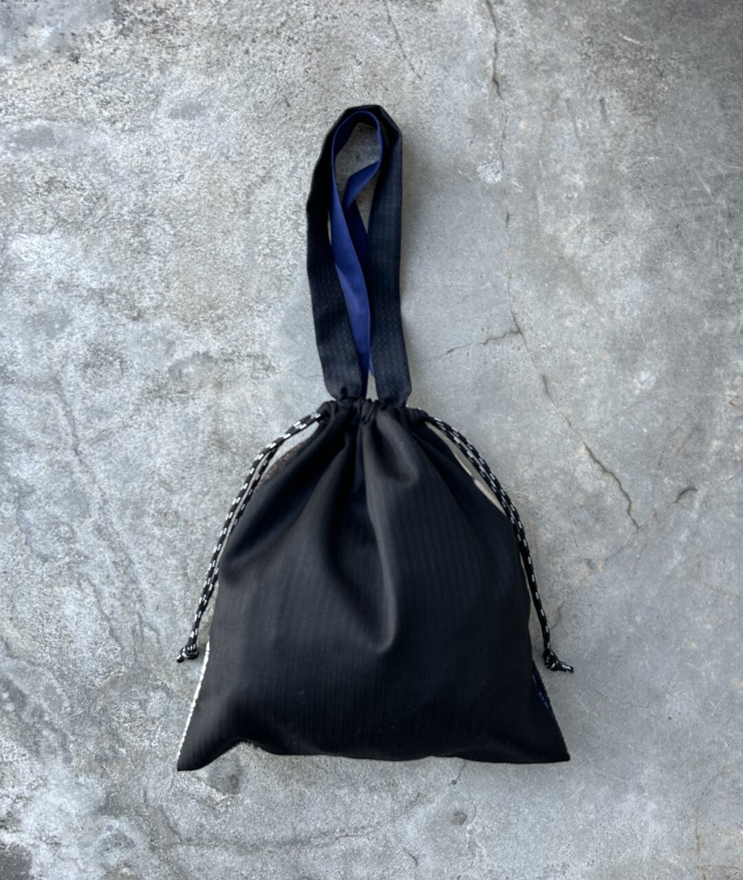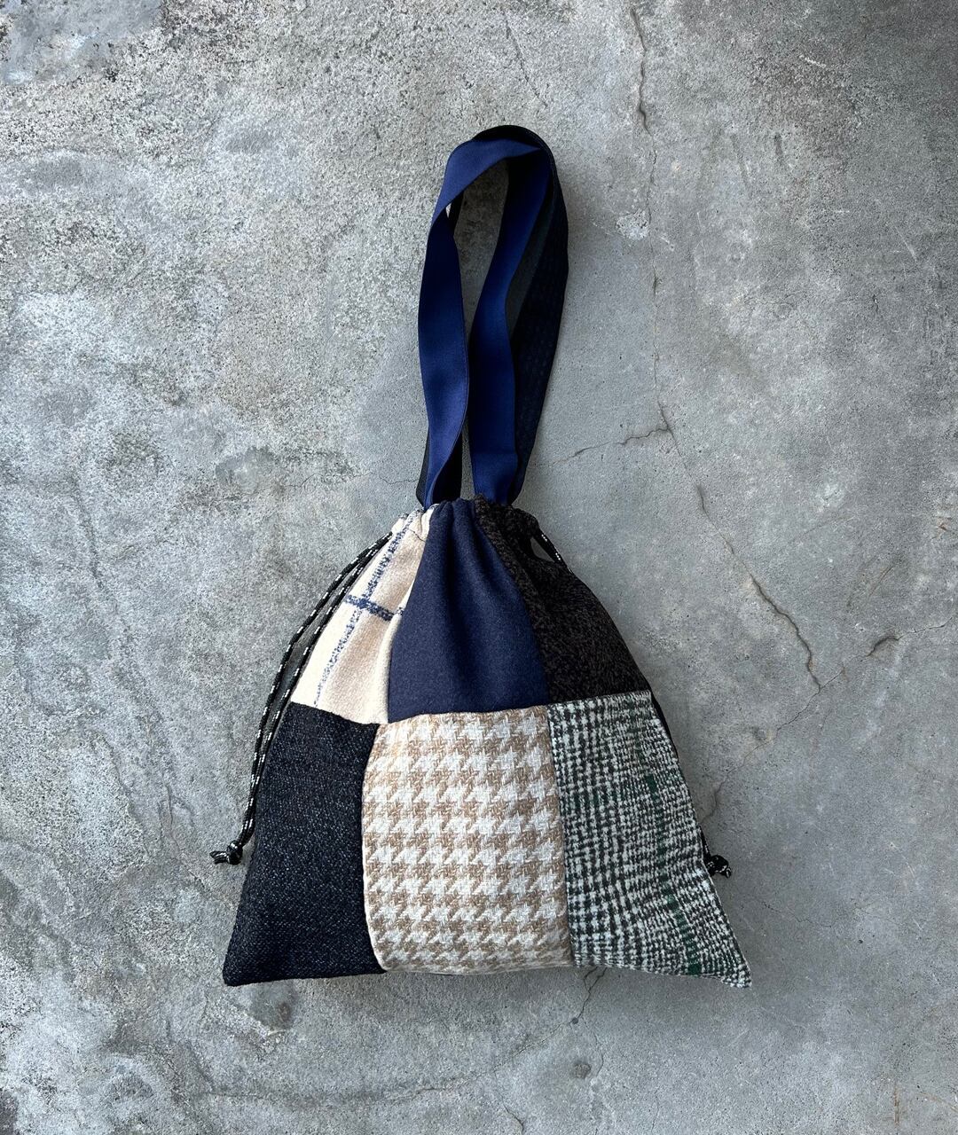 老舗スーツ工場から生産する際に出る端材、残生地を利用したパッチワークの巾着バッグ。