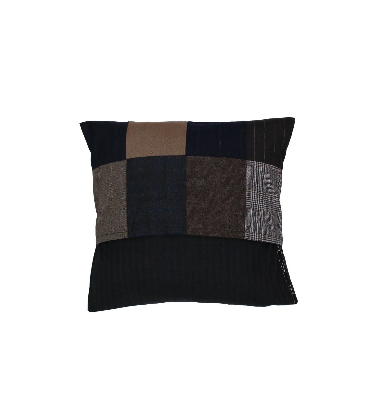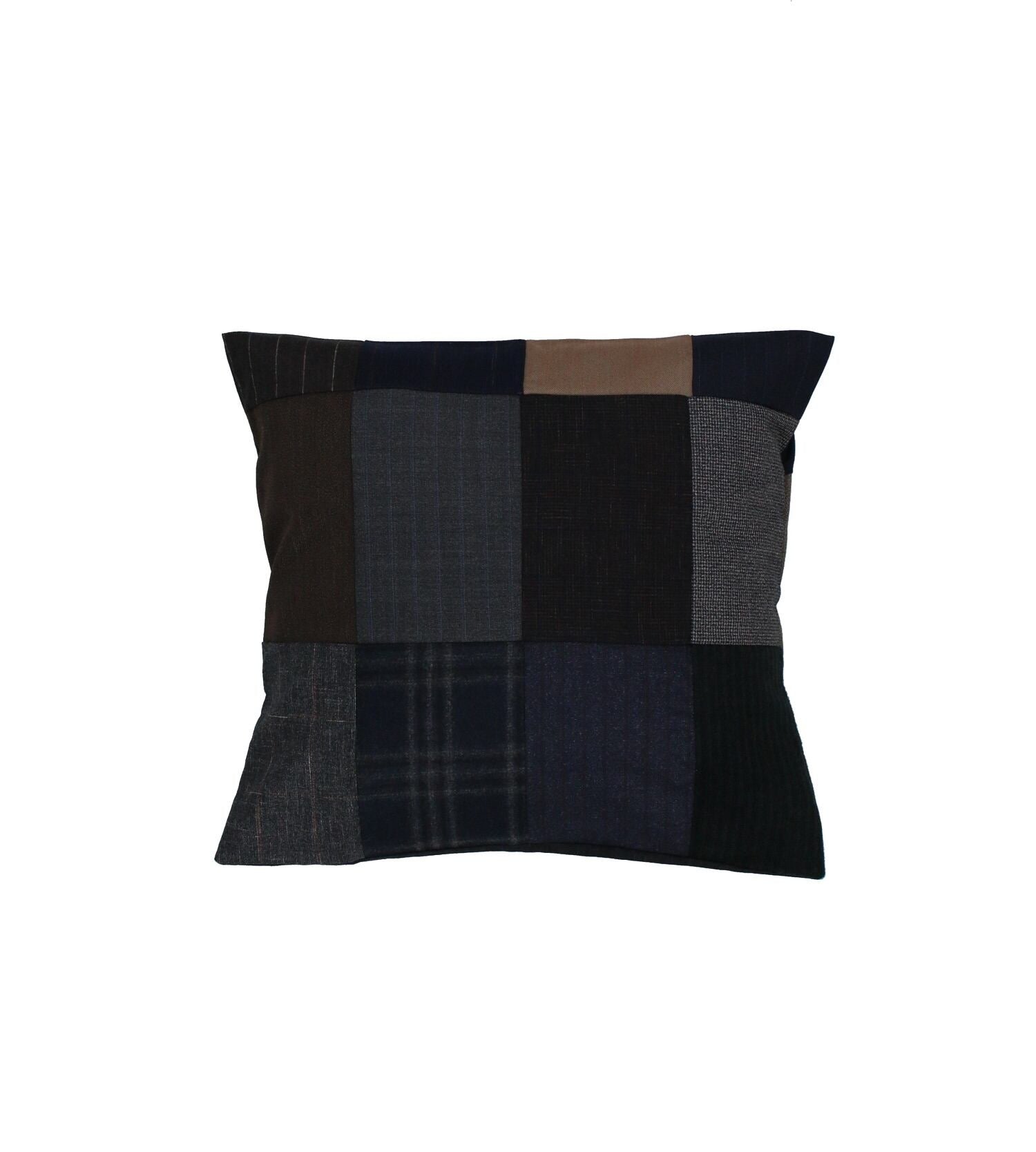 老舗スーツ工場から生産する際に出る端材、残生地を利用したパッチワークのクッションカバー。