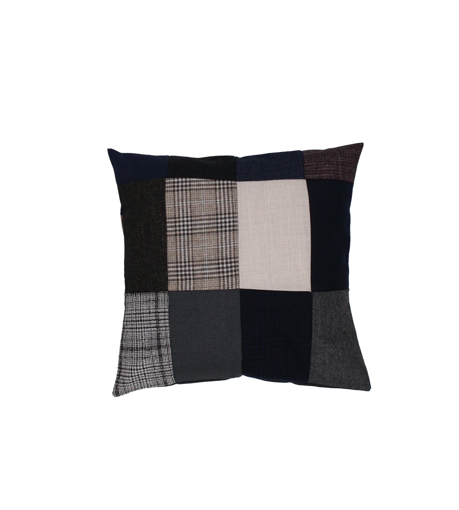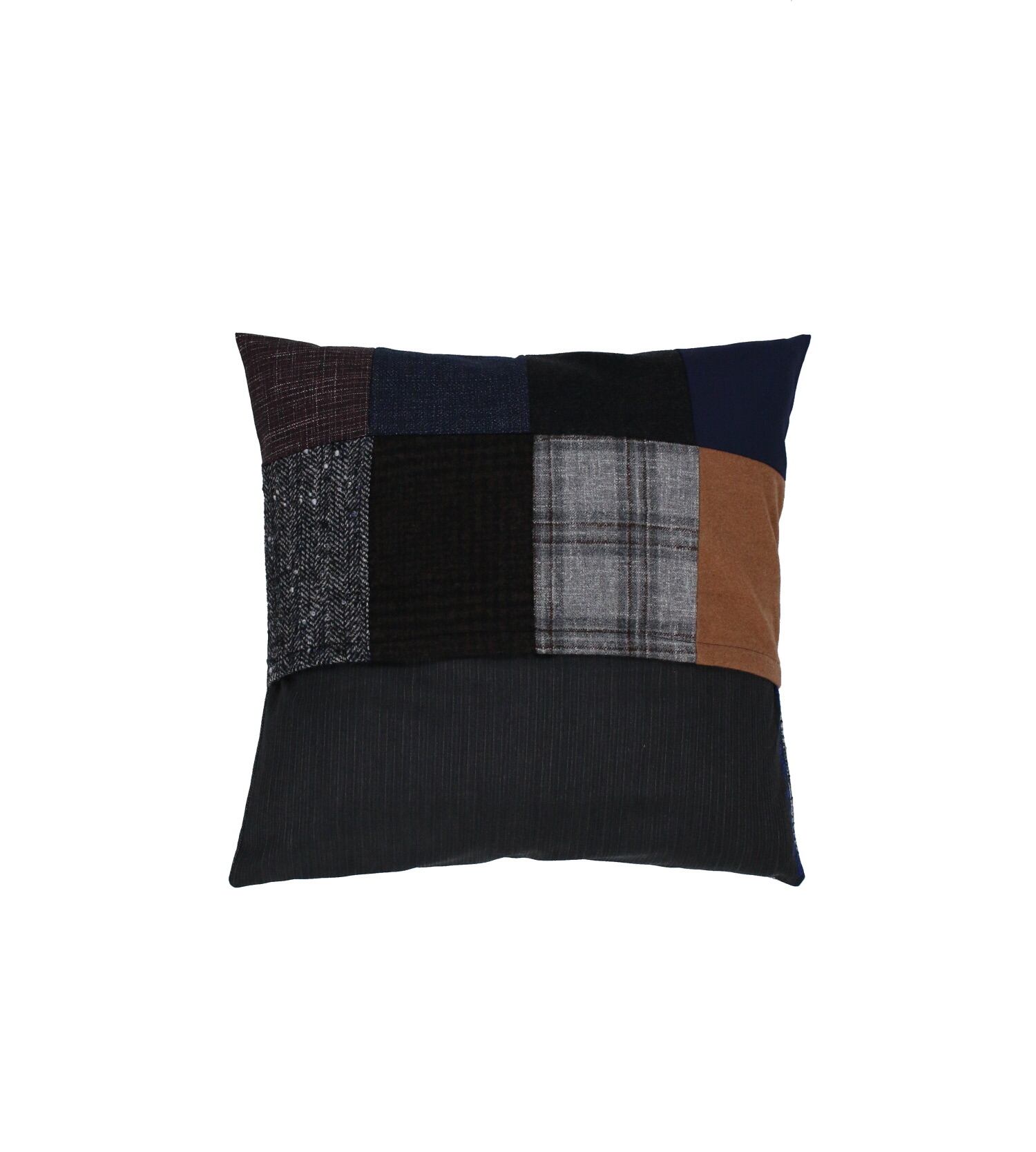 老舗スーツ工場から生産する際に出る端材、残生地を利用したパッチワークのクッションカバー。