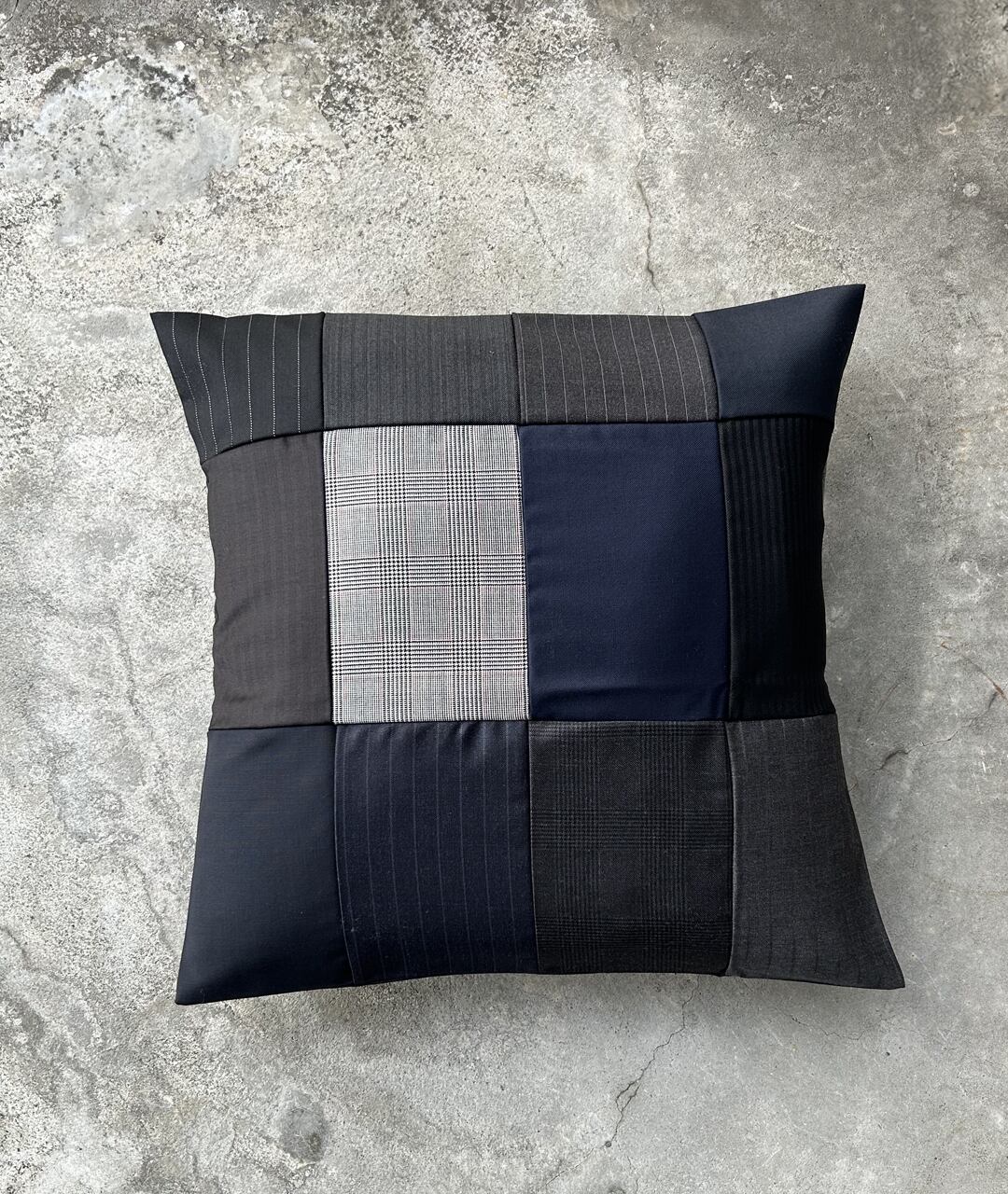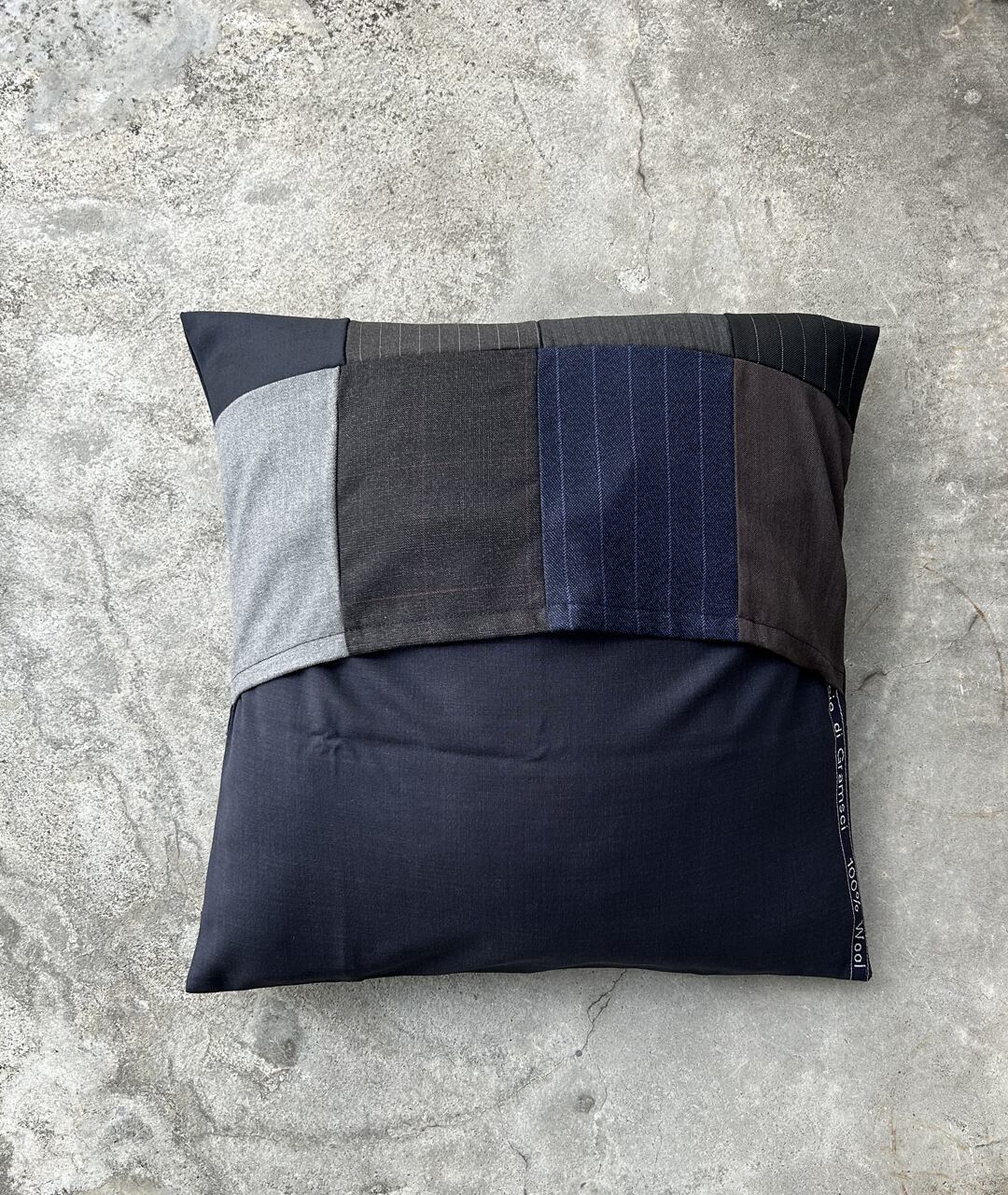 老舗スーツ工場から生産する際に出る端材、残生地を利用したパッチワークのクッションカバー。