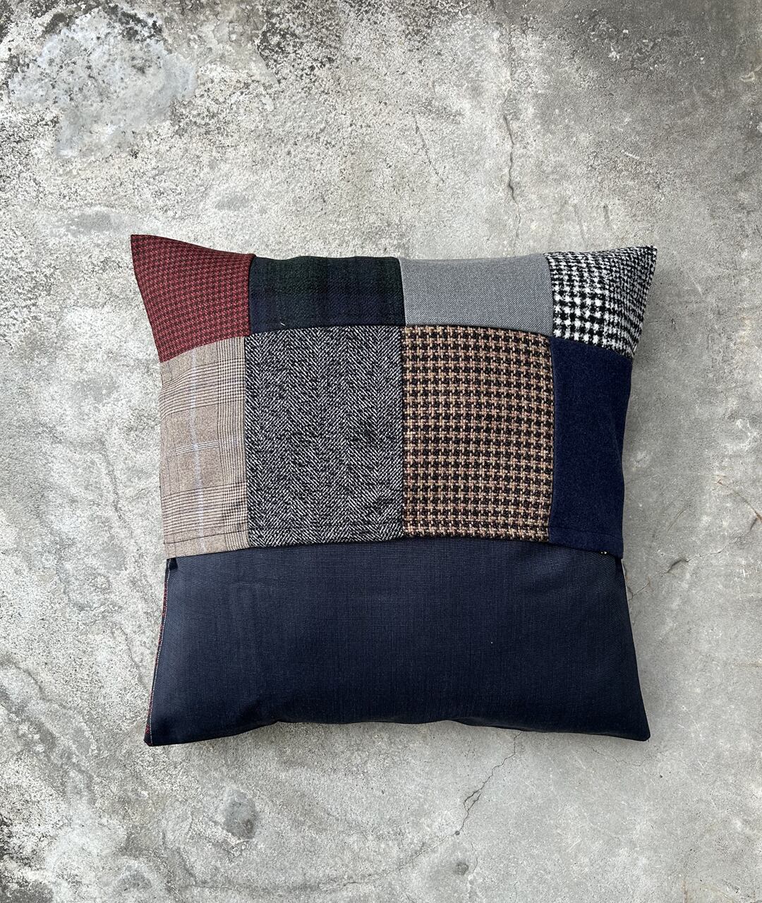 老舗スーツ工場から生産する際に出る端材、残生地を利用したパッチワークのクッションカバー。