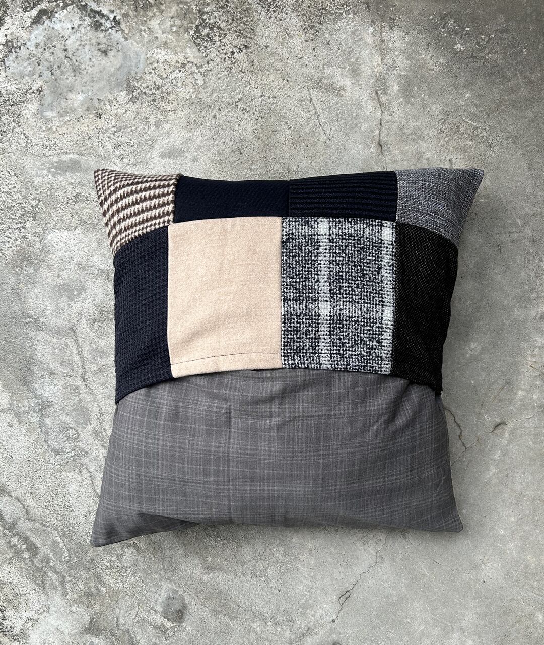 老舗スーツ工場から生産する際に出る端材、残生地を利用したパッチワークのクッションカバー。