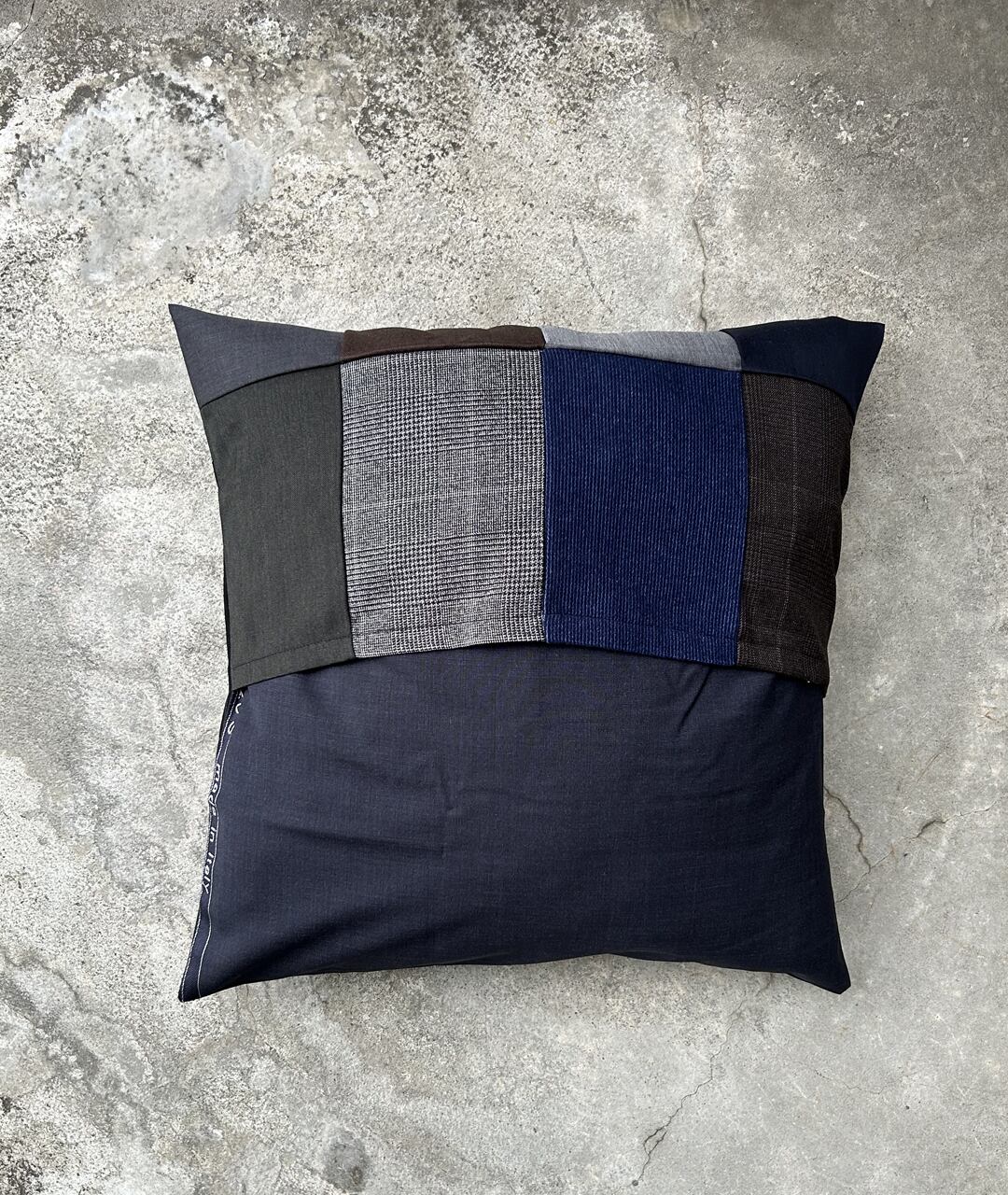 老舗スーツ工場から生産する際に出る端材、残生地を利用したパッチワークのクッションカバー。