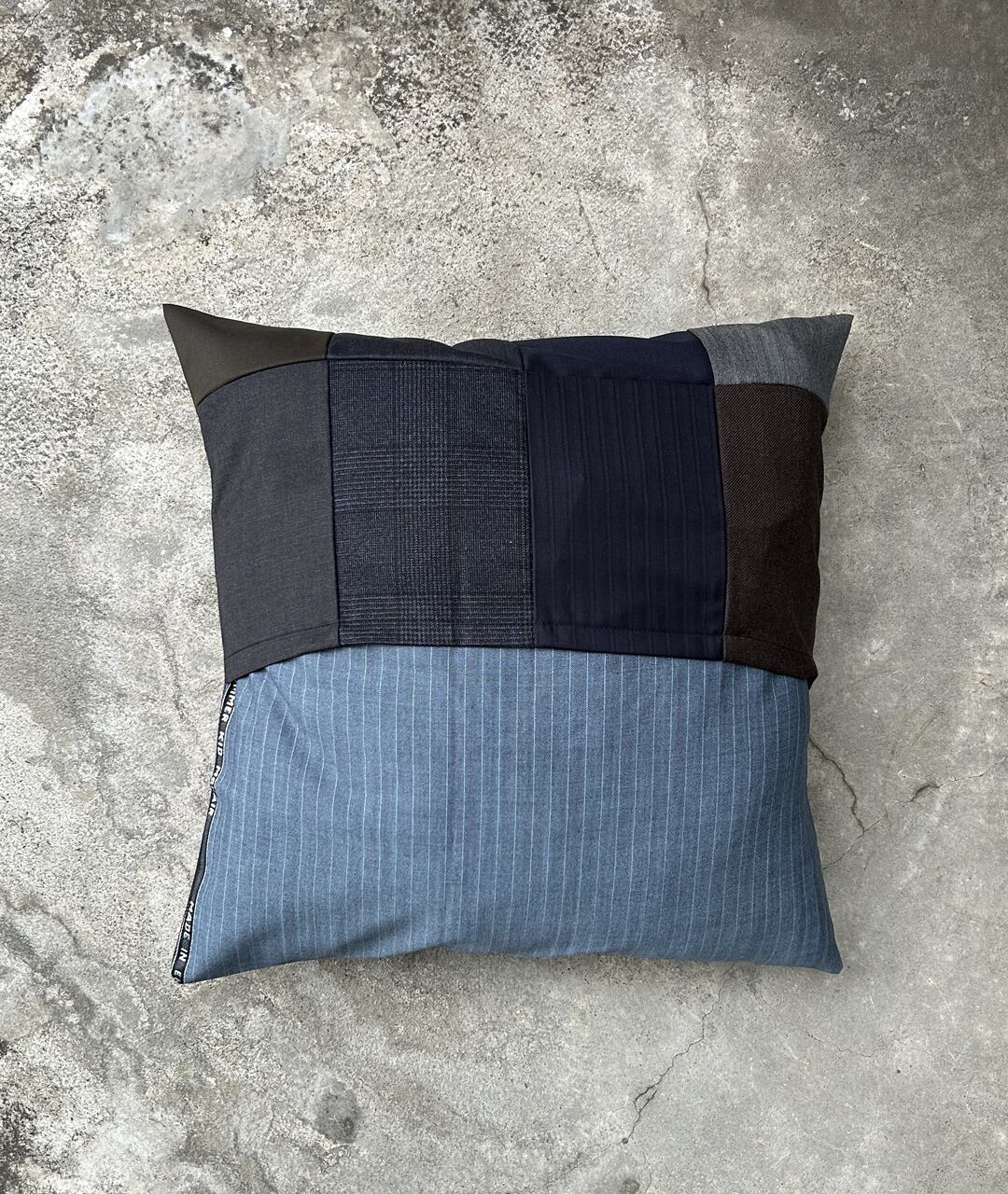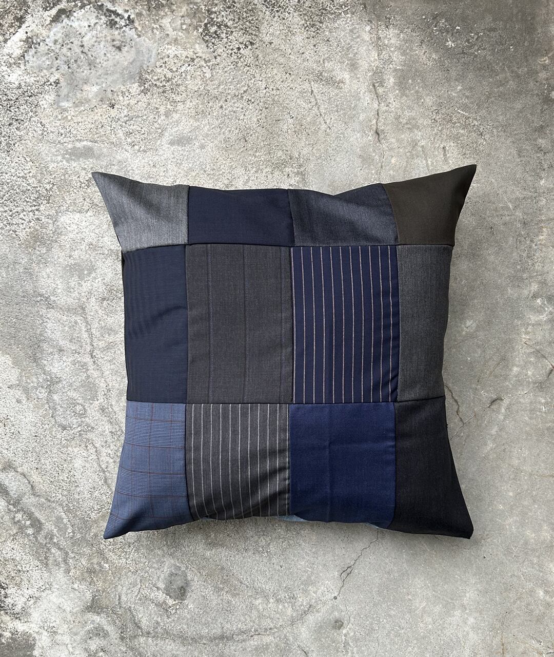 老舗スーツ工場から生産する際に出る端材、残生地を利用したパッチワークのクッションカバー。