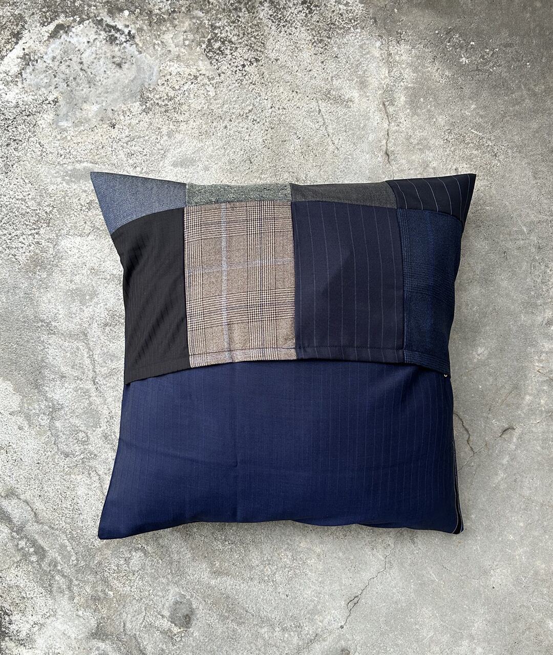 老舗スーツ工場から生産する際に出る端材、残生地を利用したパッチワークのクッションカバー。