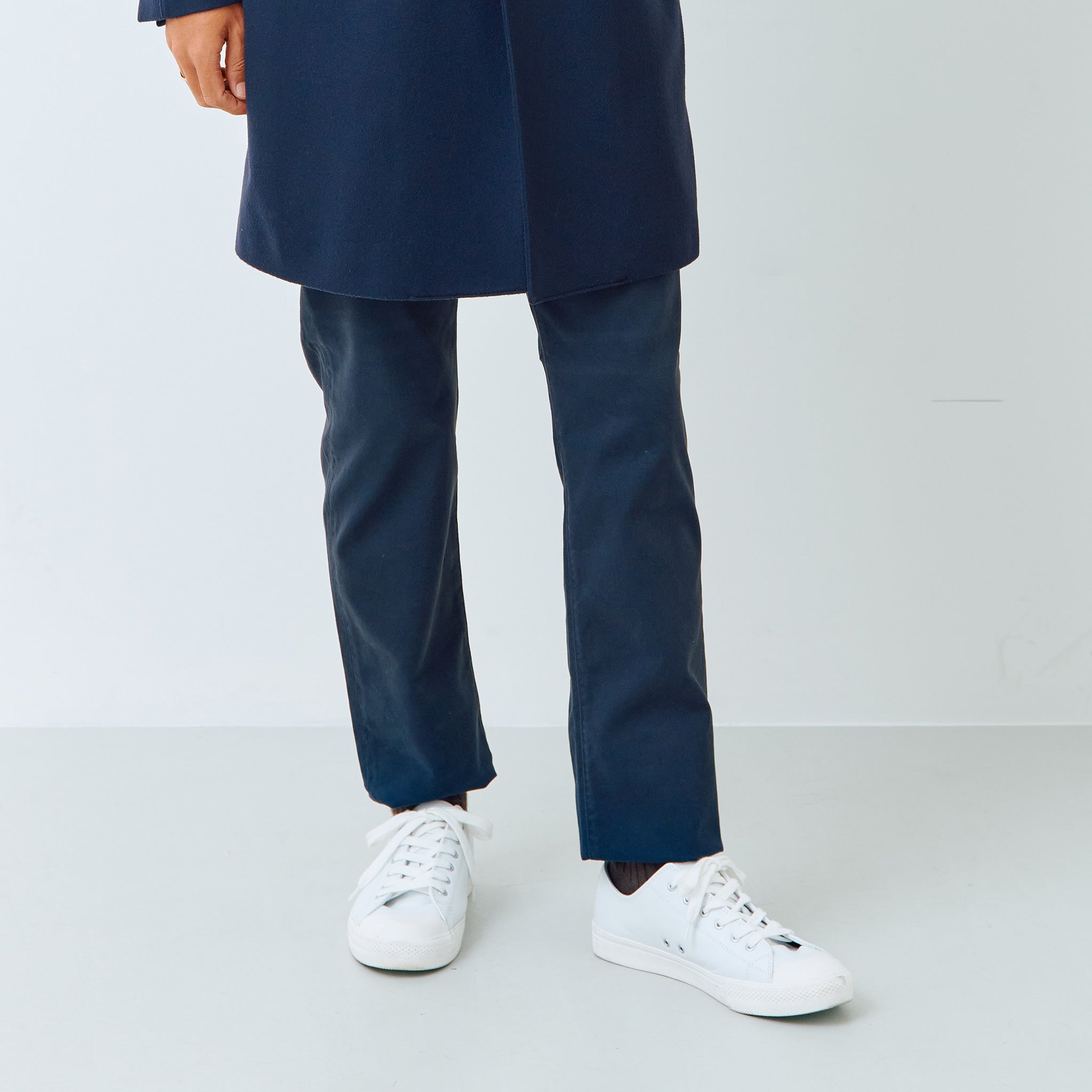 スリムフィットのノータックチノパンツ。スラントポケットとウォッチポケット付き後ろポケットは細い玉縁を施したデザインです。色落ち感が、履き込んだ雰囲気を醸し出します。