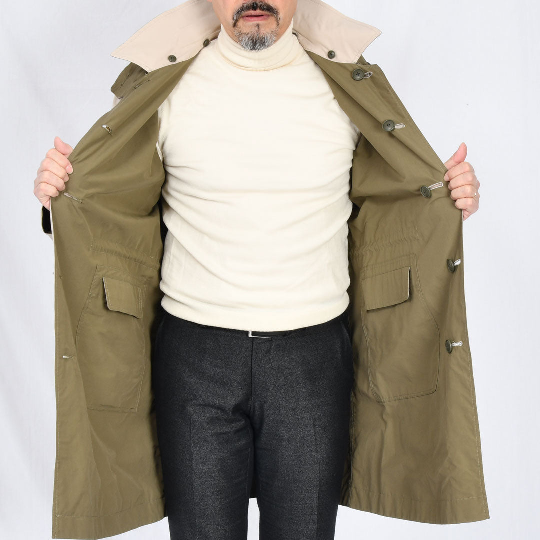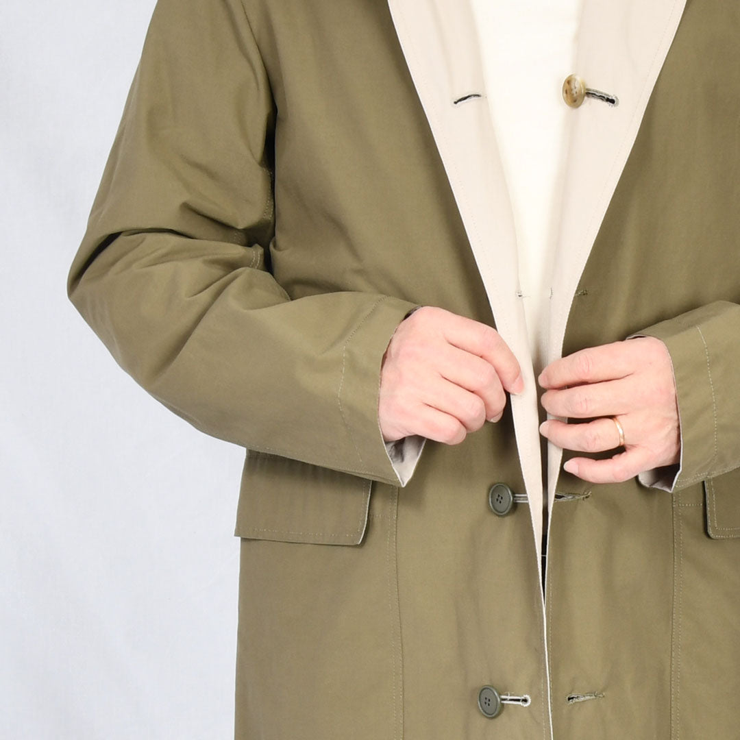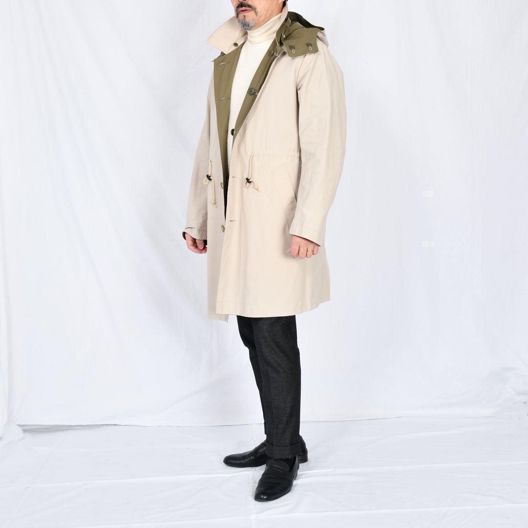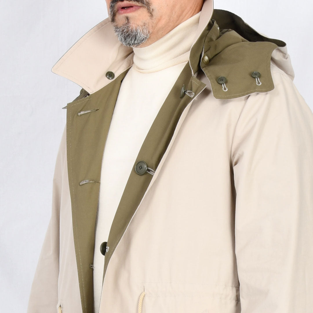 上品なカーキとベージュの配色が魅力の、春先から秋口まで活躍するライトアウター。表面はミリタリーテイストのカーキ、裏面は柔らかなベージュカラーで、気分やシーンに合わせて印象をチェンジできます。フードを外せばシンプルなステンカラーコートに。軽くて使いやすい、カジュアルからキレイ目まで、汎用性の高いアイテムです。