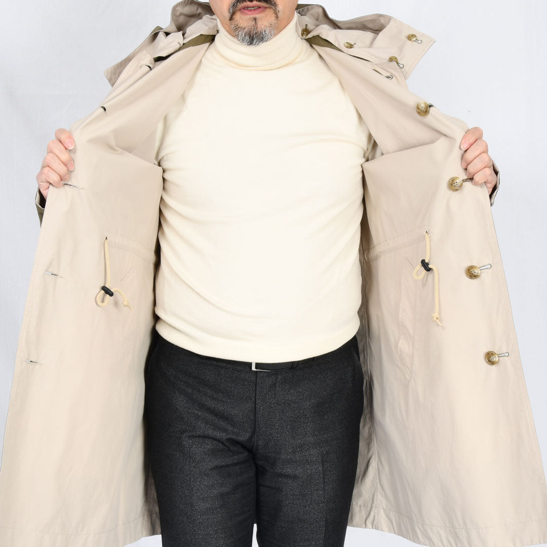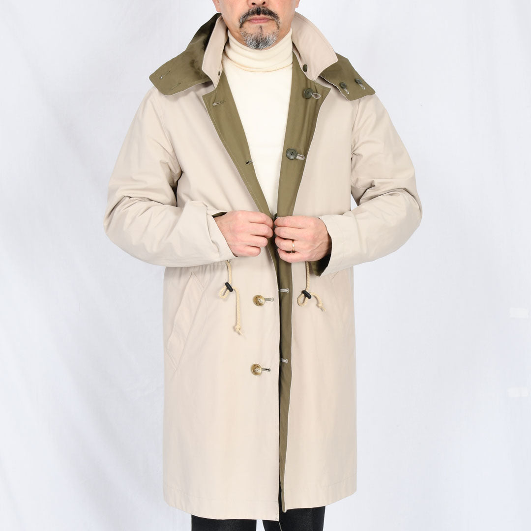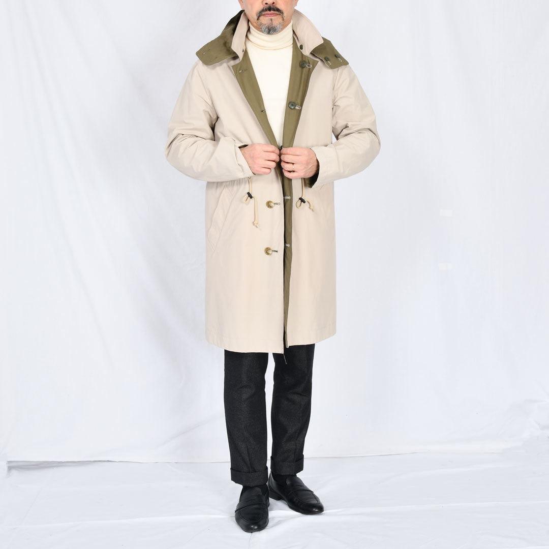 上品なカーキとベージュの配色が魅力の、春先から秋口まで活躍するライトアウター。表面はミリタリーテイストのカーキ、裏面は柔らかなベージュカラーで、気分やシーンに合わせて印象をチェンジできます。フードを外せばシンプルなステンカラーコートに。軽くて使いやすい、カジュアルからキレイ目まで、汎用性の高いアイテムです。