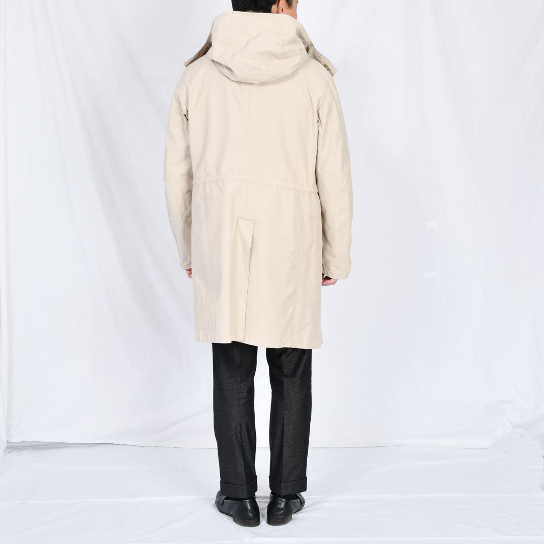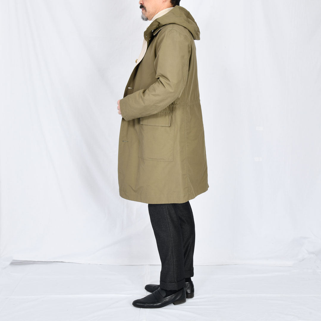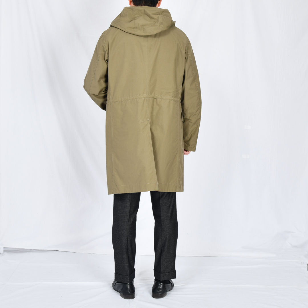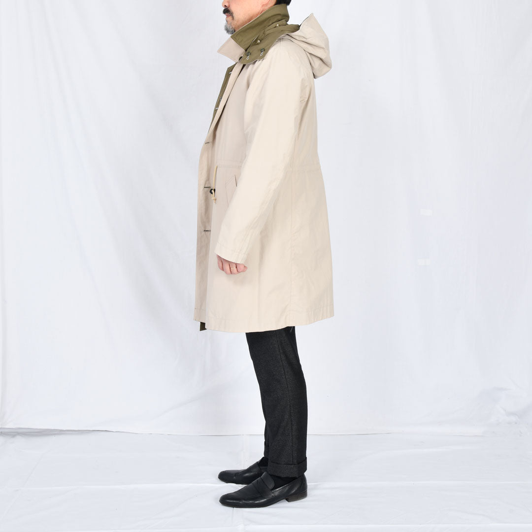 上品なカーキとベージュの配色が魅力の、春先から秋口まで活躍するライトアウター。表面はミリタリーテイストのカーキ、裏面は柔らかなベージュカラーで、気分やシーンに合わせて印象をチェンジできます。フードを外せばシンプルなステンカラーコートに。軽くて使いやすい、カジュアルからキレイ目まで、汎用性の高いアイテムです。