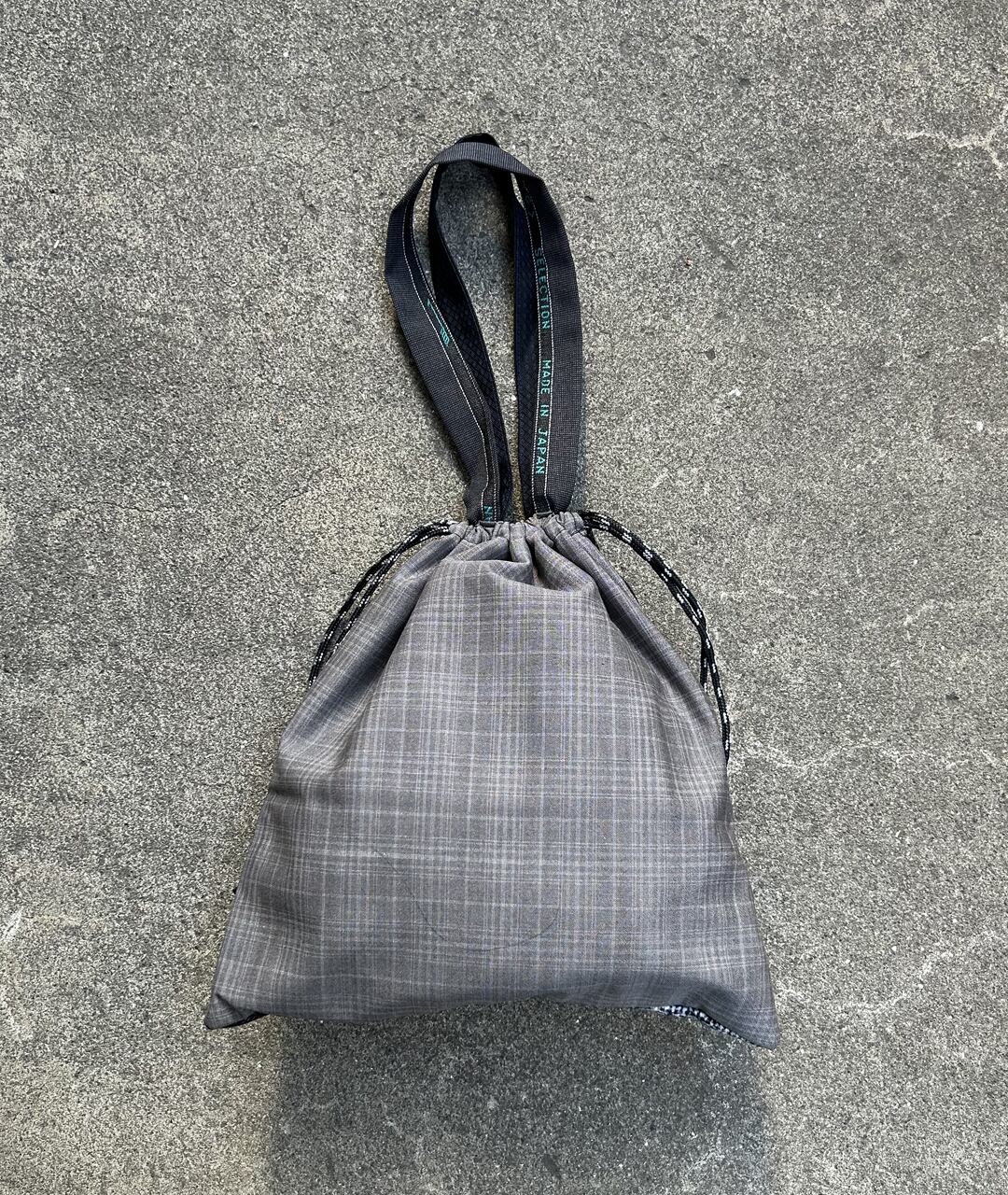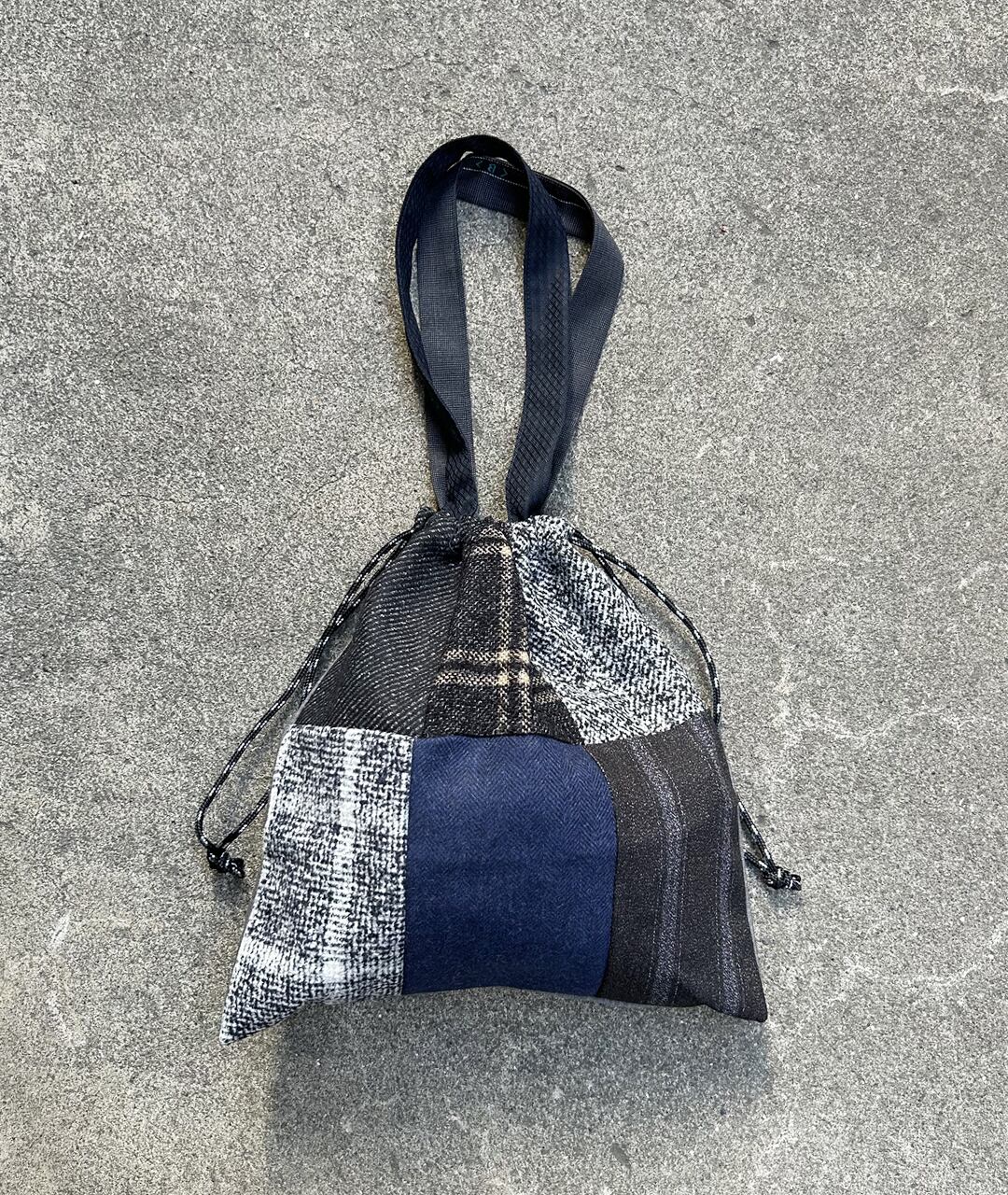 老舗スーツ工場から生産する際に出る端材、残生地を利用したパッチワークの巾着バッグ。