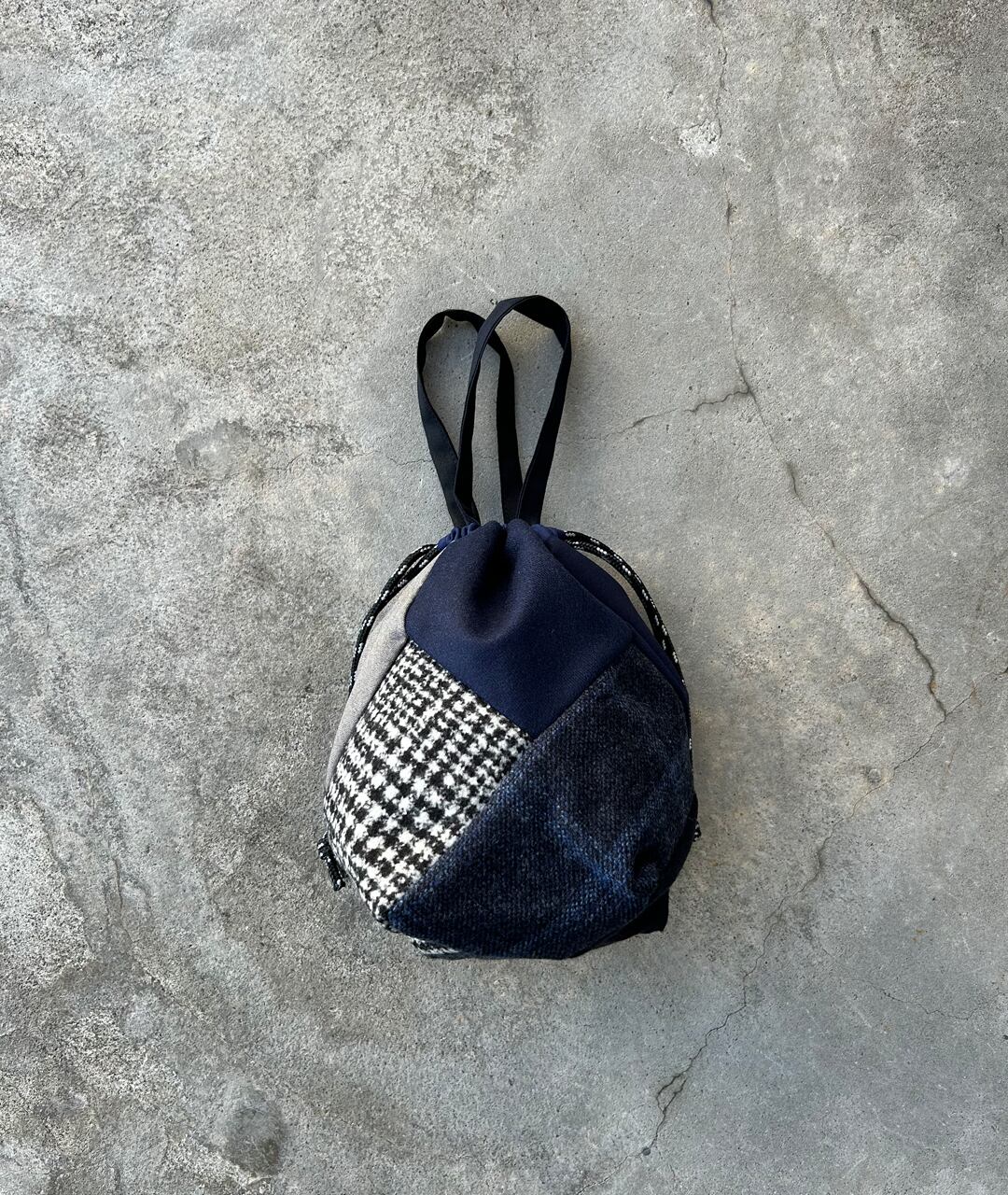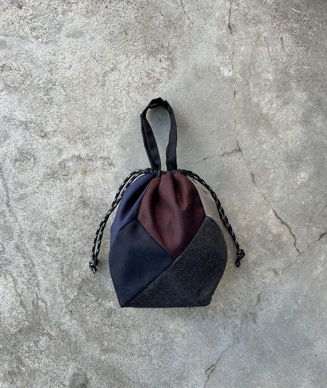 老舗スーツ工場から生産する際に出る端材、残生地を利用したバイアスの小ぶりな巾着バッグ。