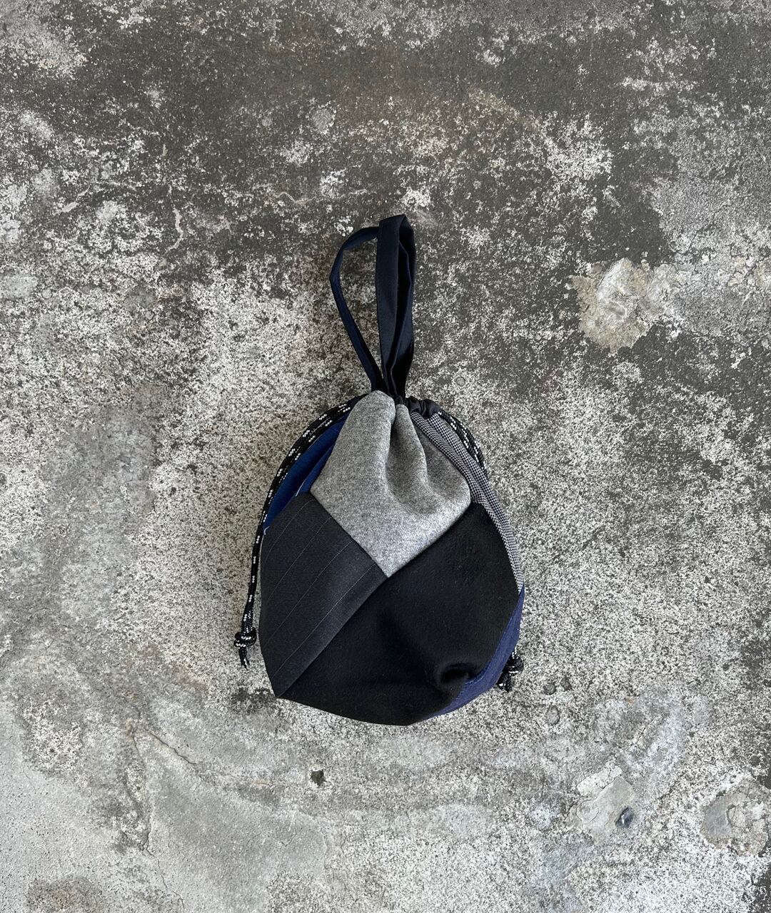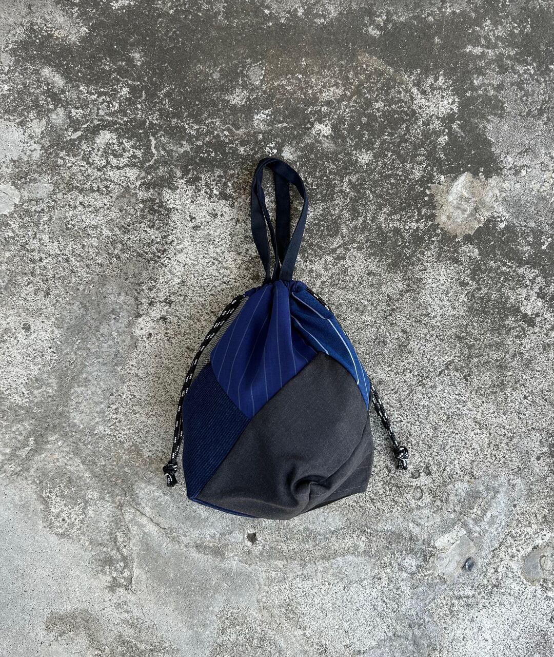 老舗スーツ工場から生産する際に出る端材、残生地を利用したバイアスの小ぶりな巾着バッグ。