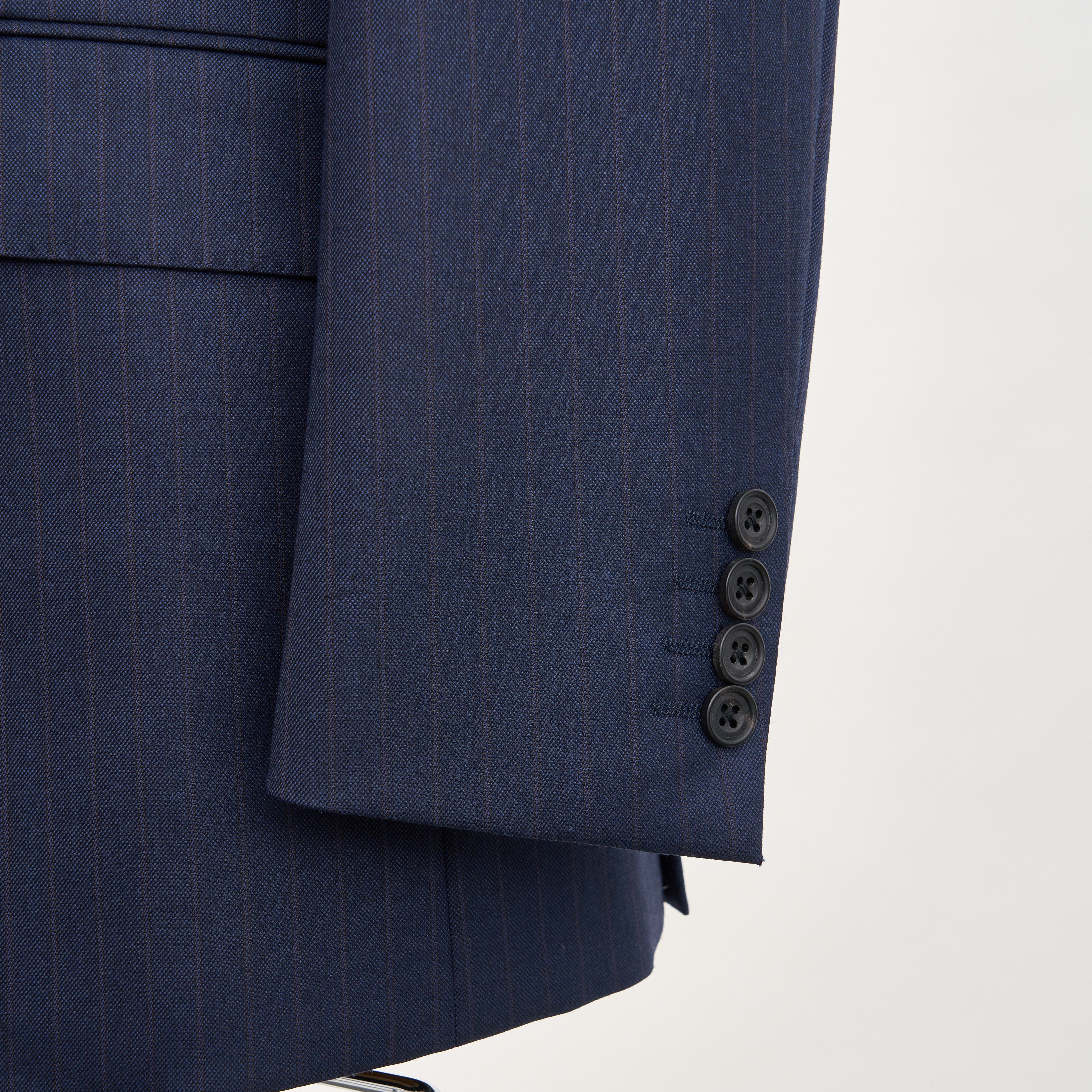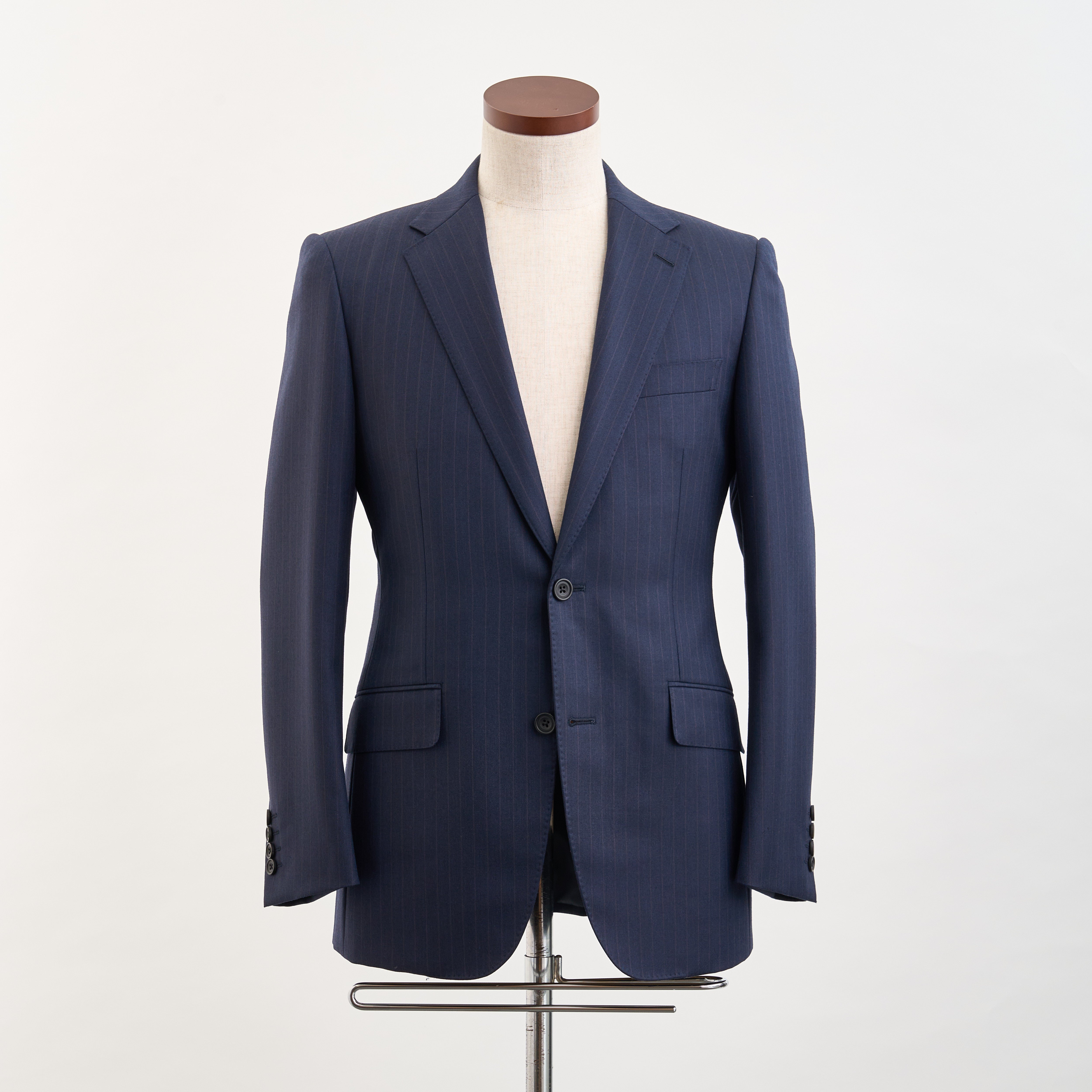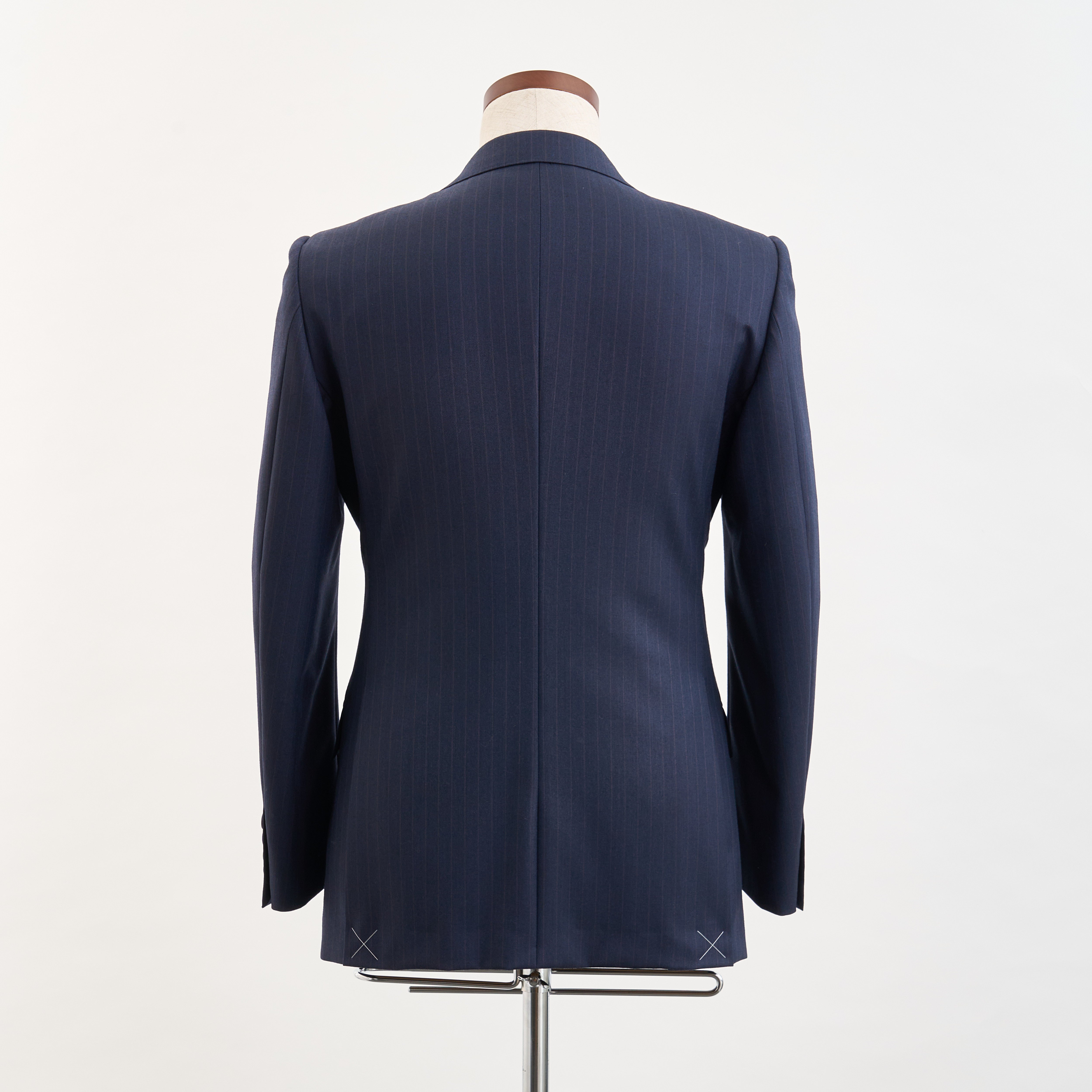 クラシックなネイビーカラーに、縦のラインを強調するピンストライプが映える一着。