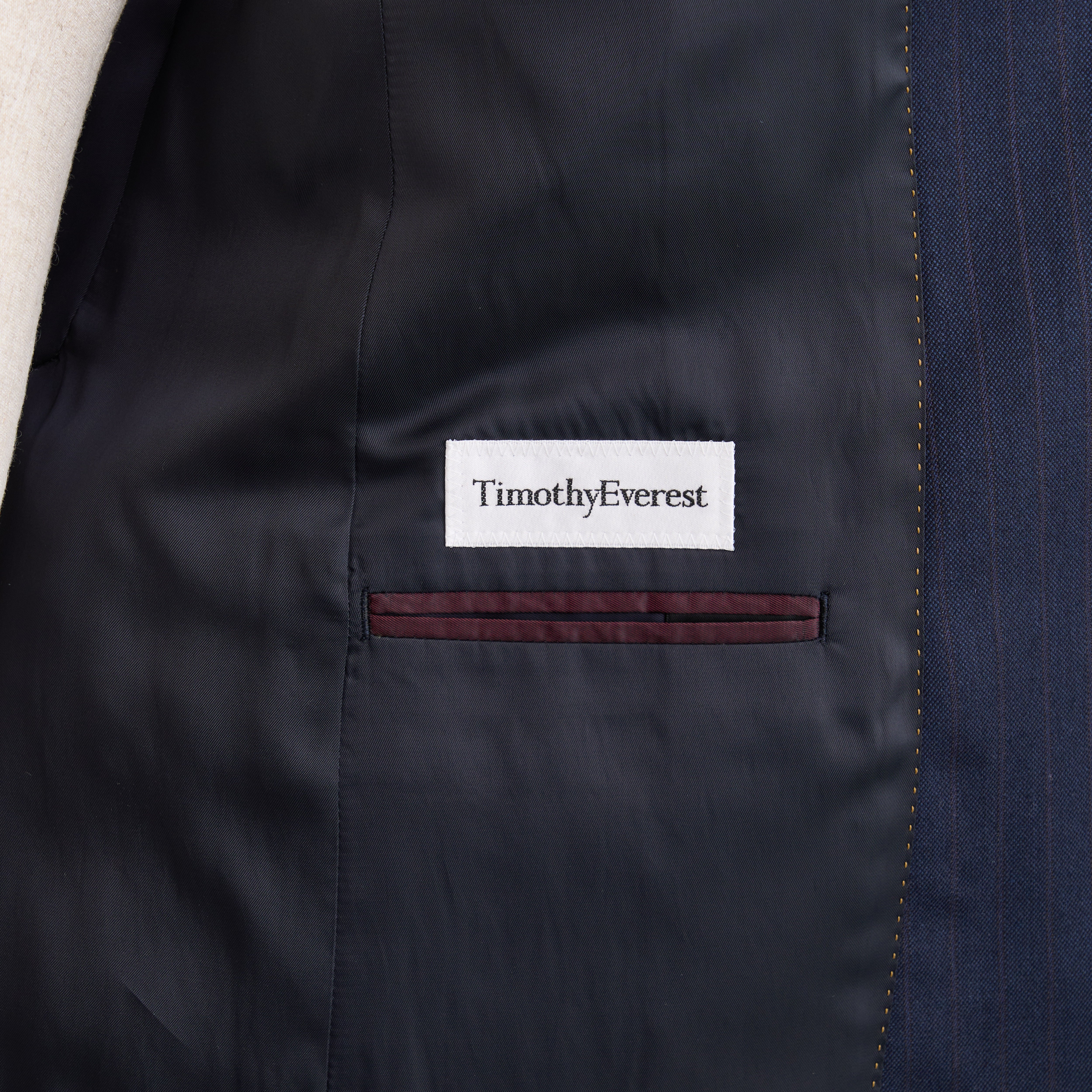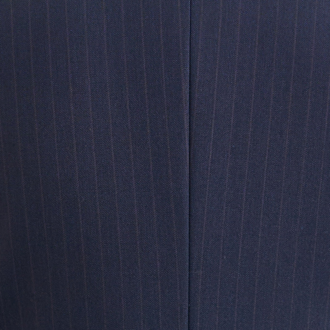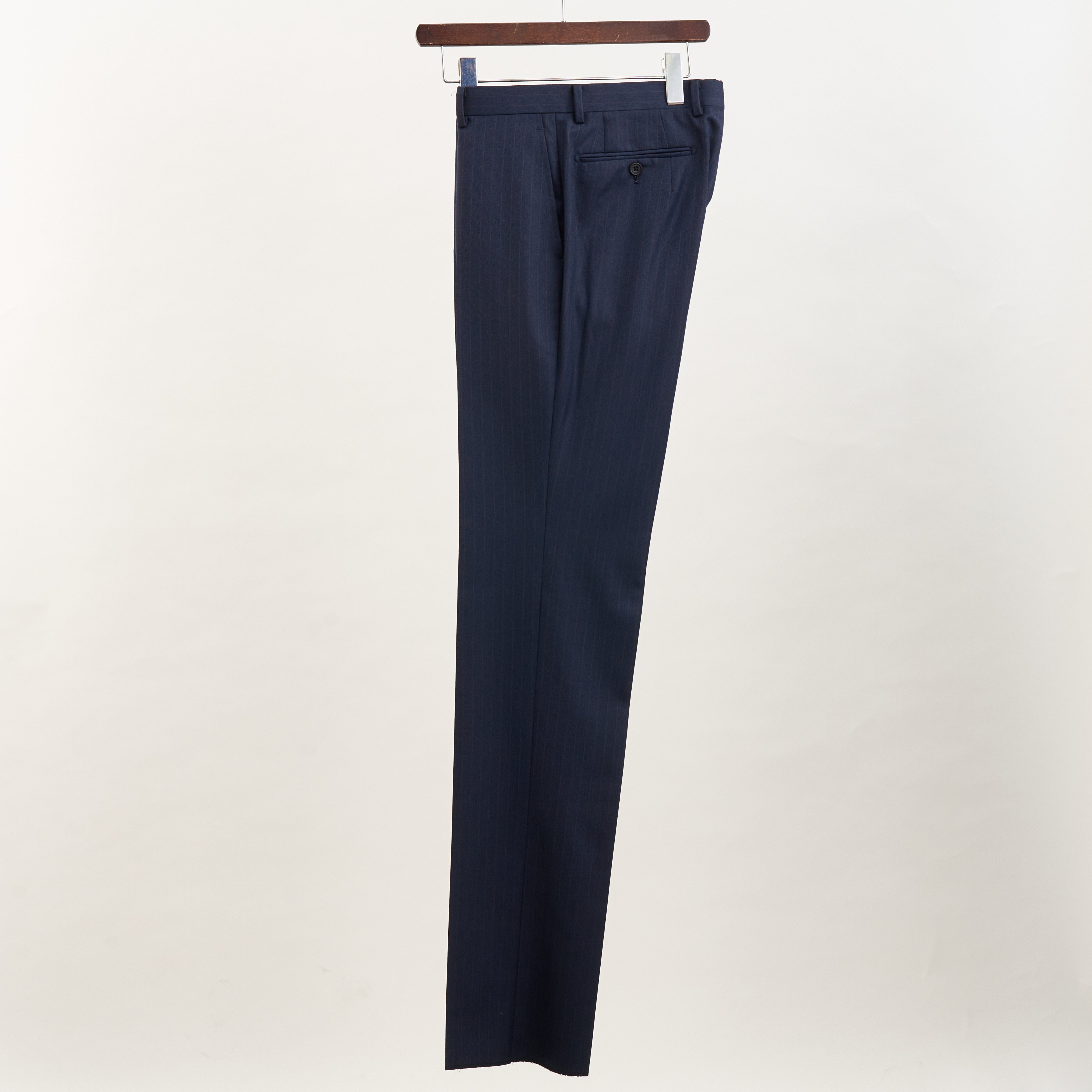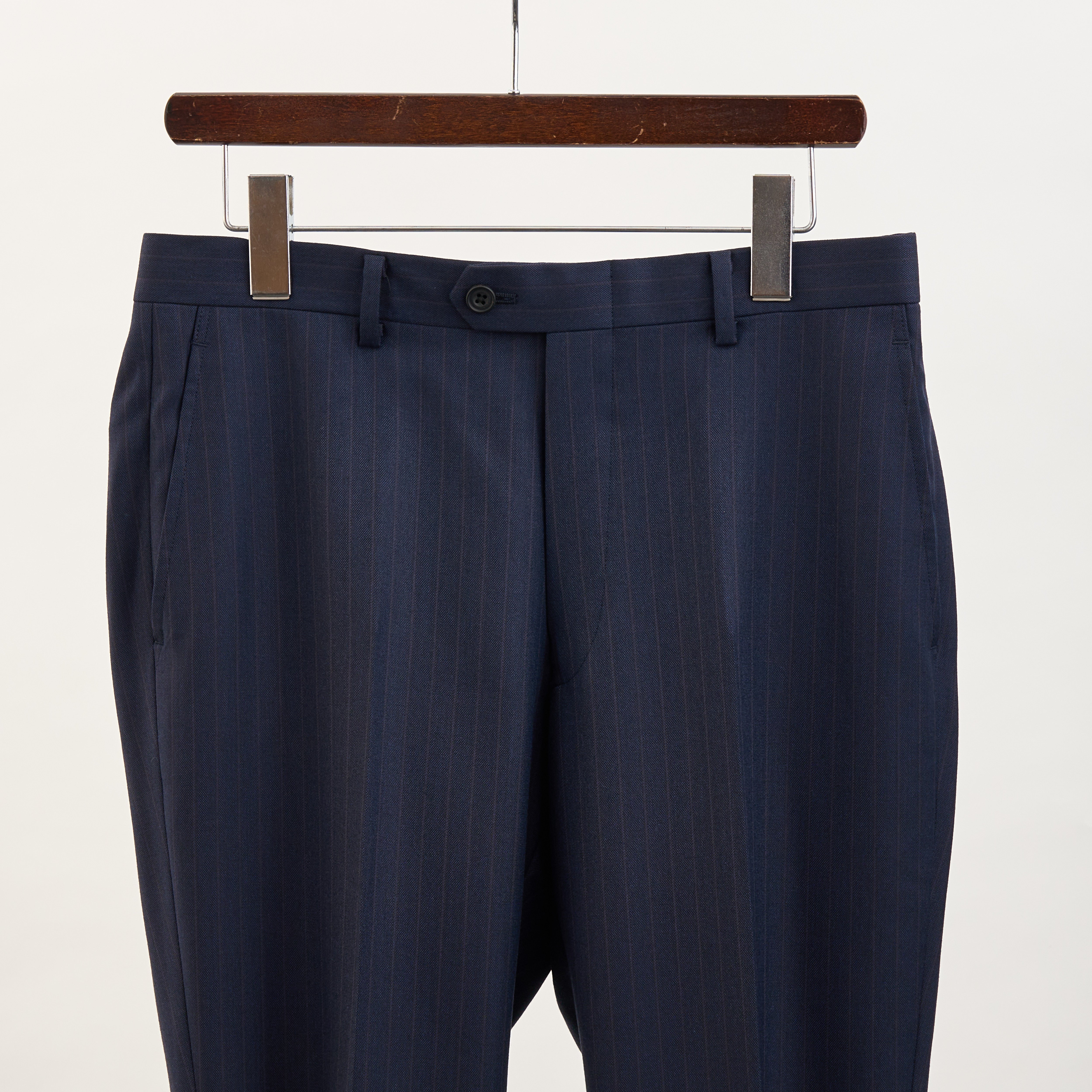 クラシックなネイビーカラーに、縦のラインを強調するピンストライプが映える一着。