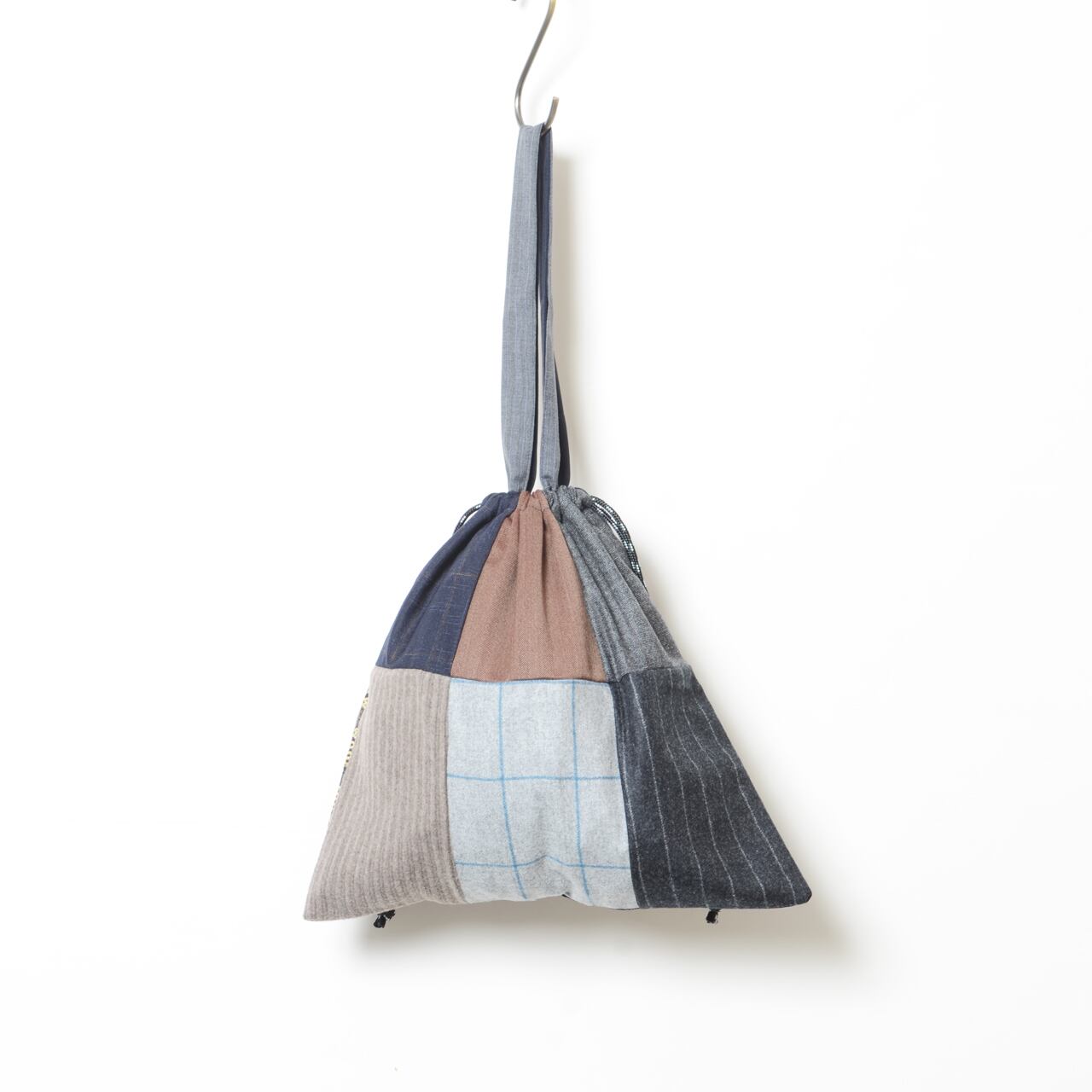 老舗スーツ工場から生産する際に出る端材、残生地を利用したパッチワークの巾着バッグ。