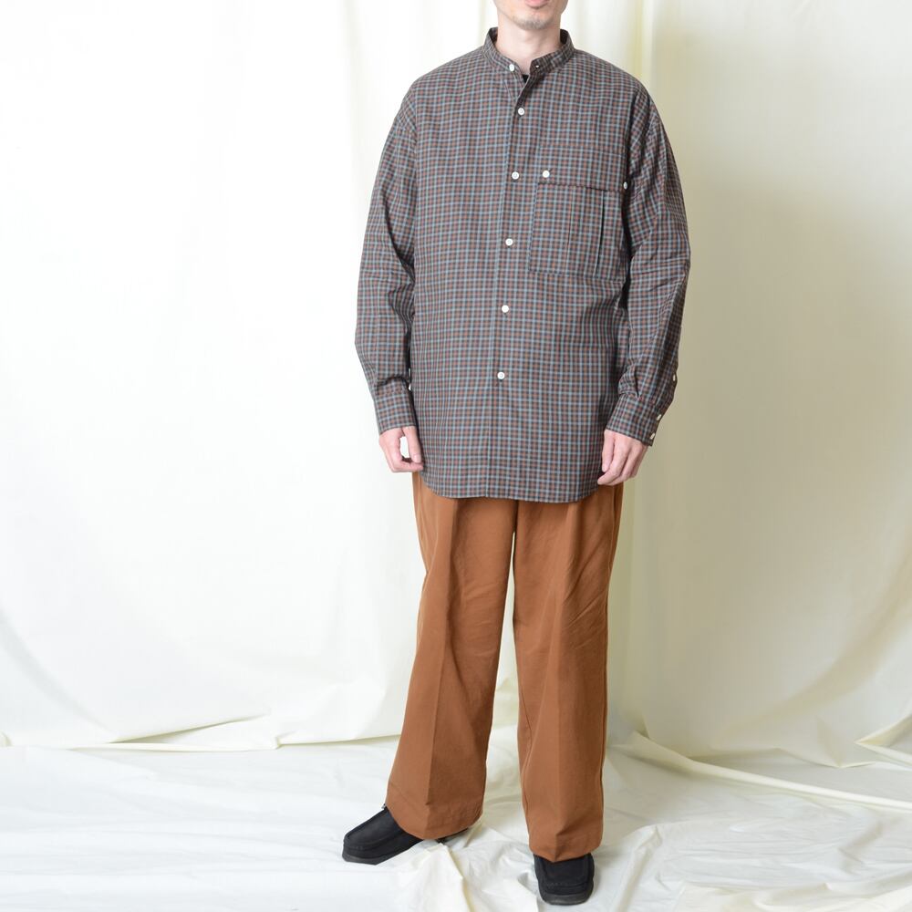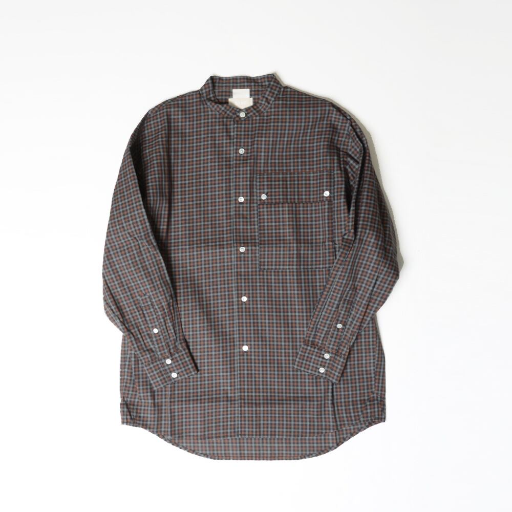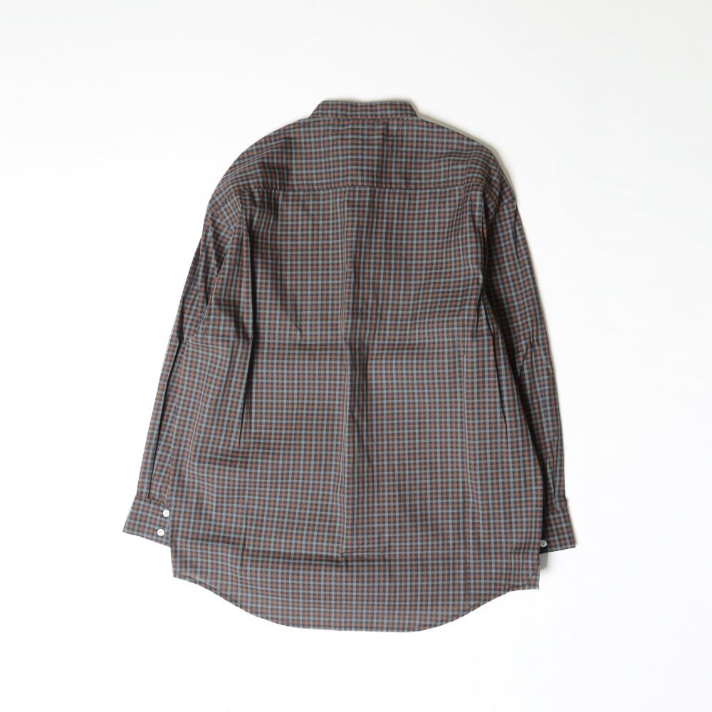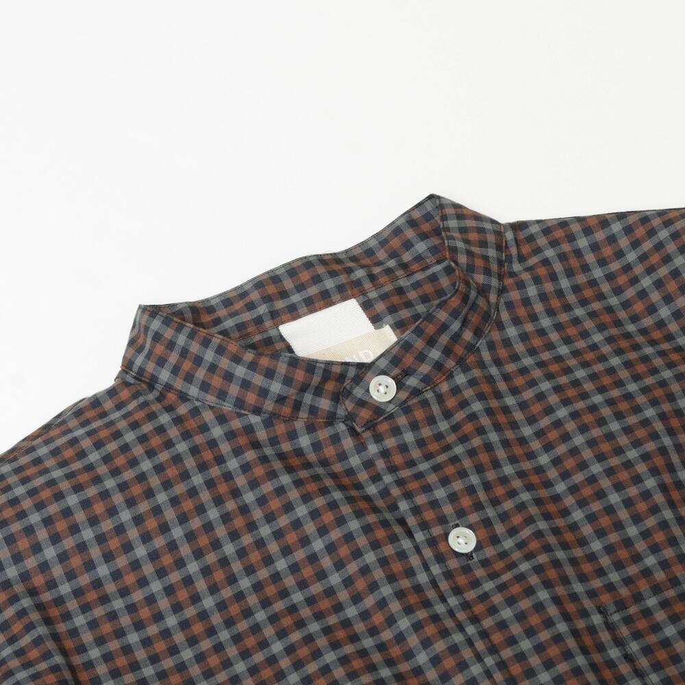 落ち着いたカラーのチェック柄で、カジュアルすぎない雰囲気でハリのある固めな素材感のチェックシャツ。